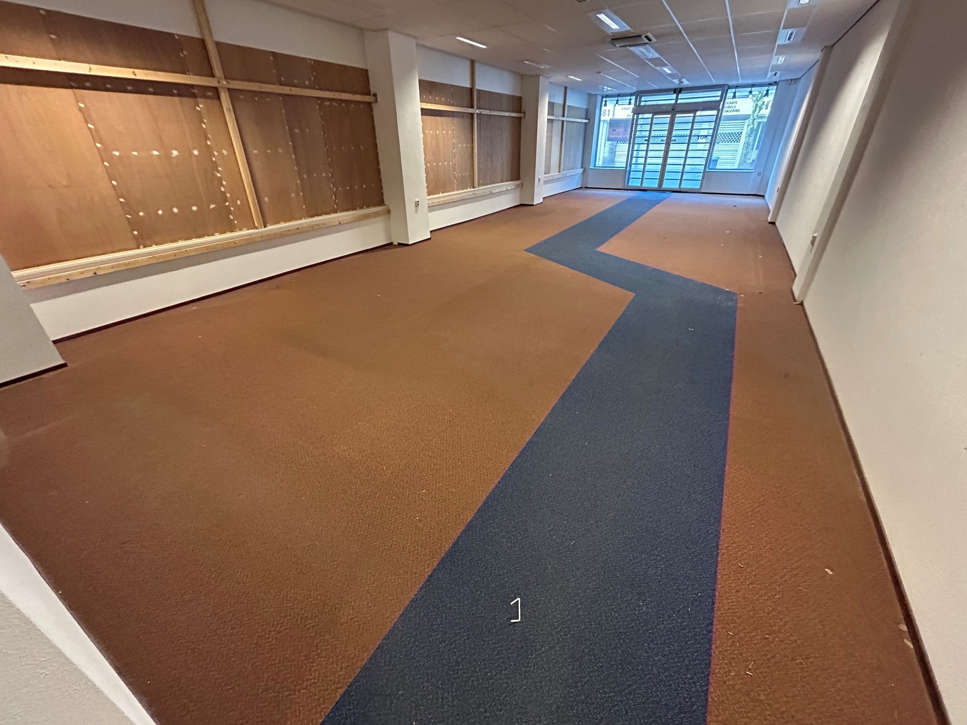 Winkel/verkoopruimte 27,10 x 5,70 met vloerbedekking en systeemplafond met verlichting.