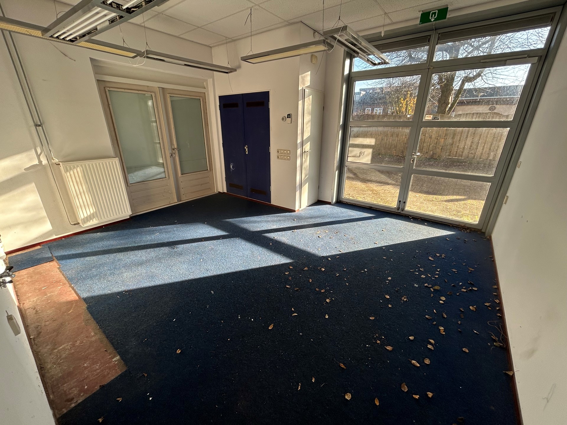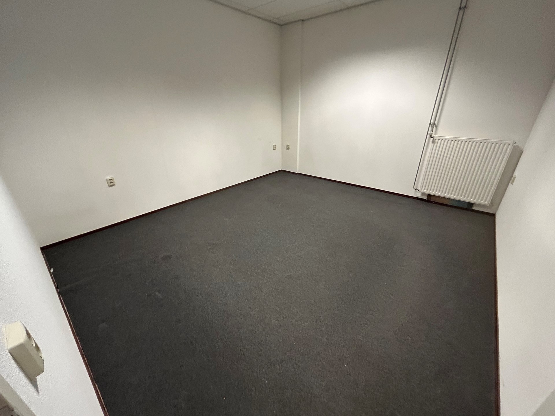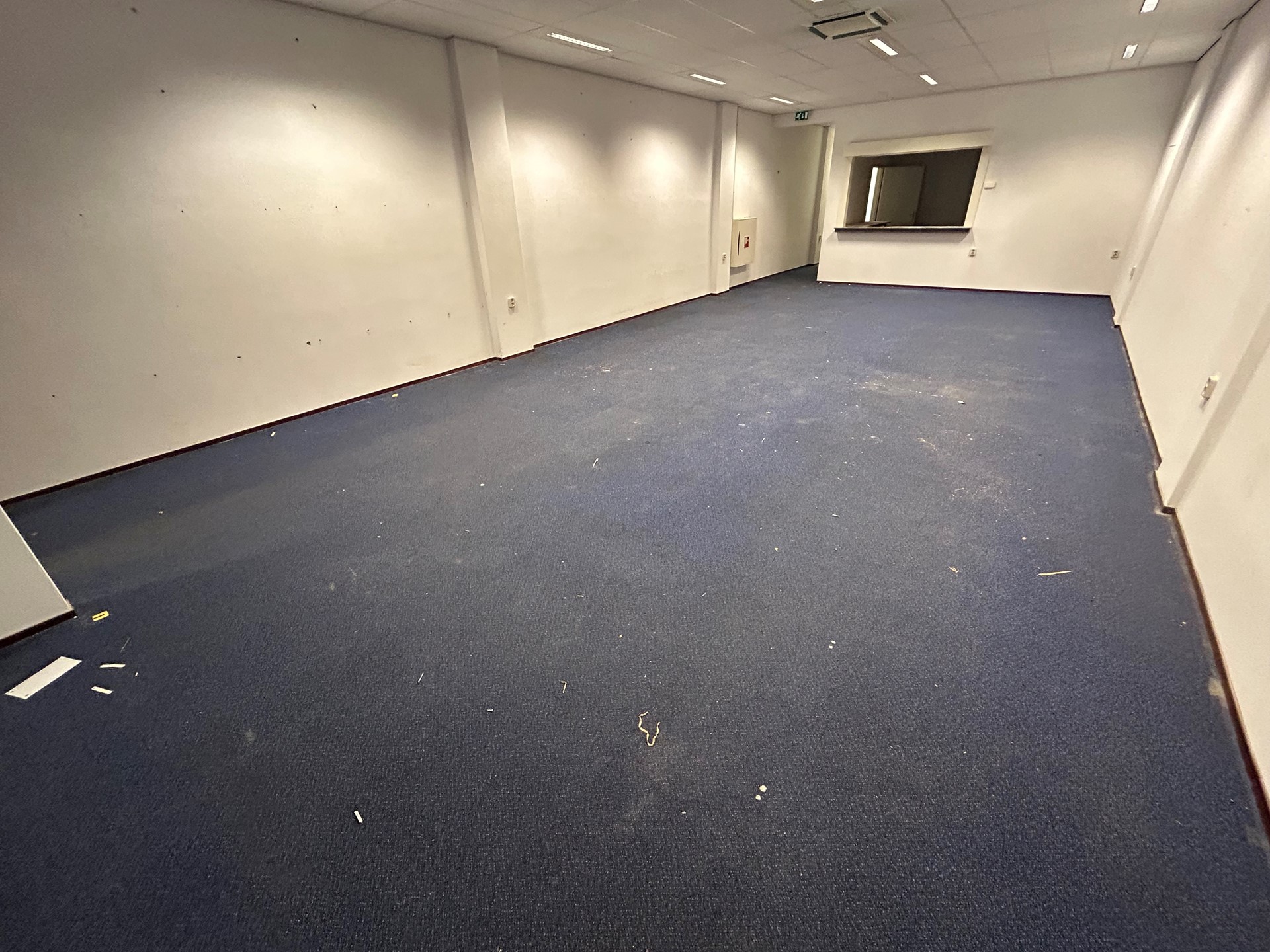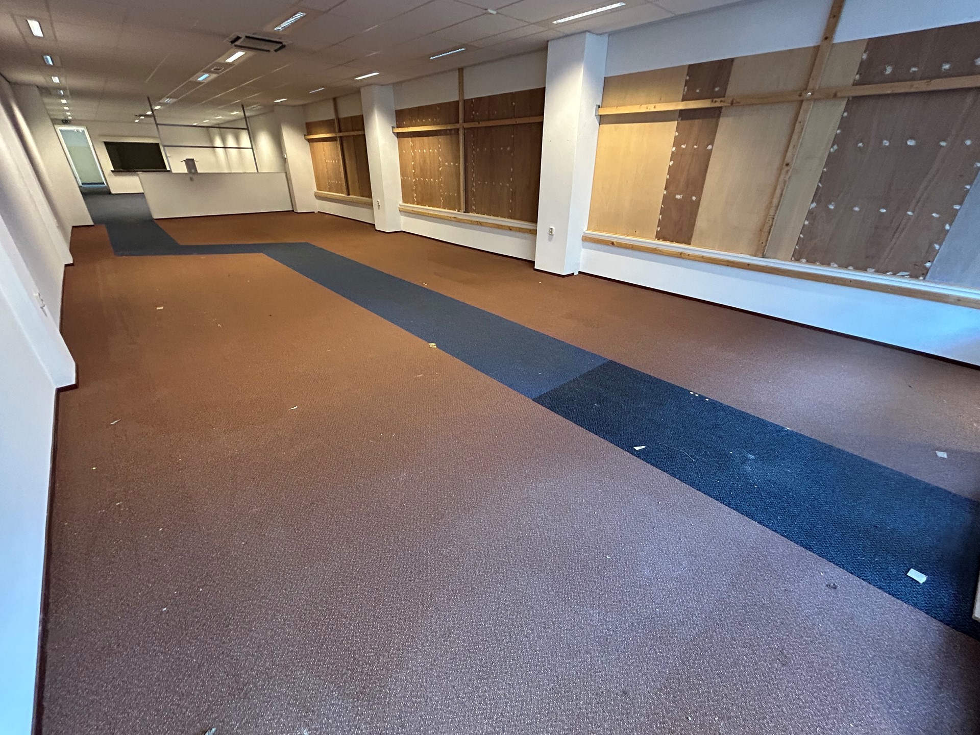 Bureau/vergader/opslagruimte 4,40 x 4,00 met vloerbedekking en systeemplafond met verlichting.