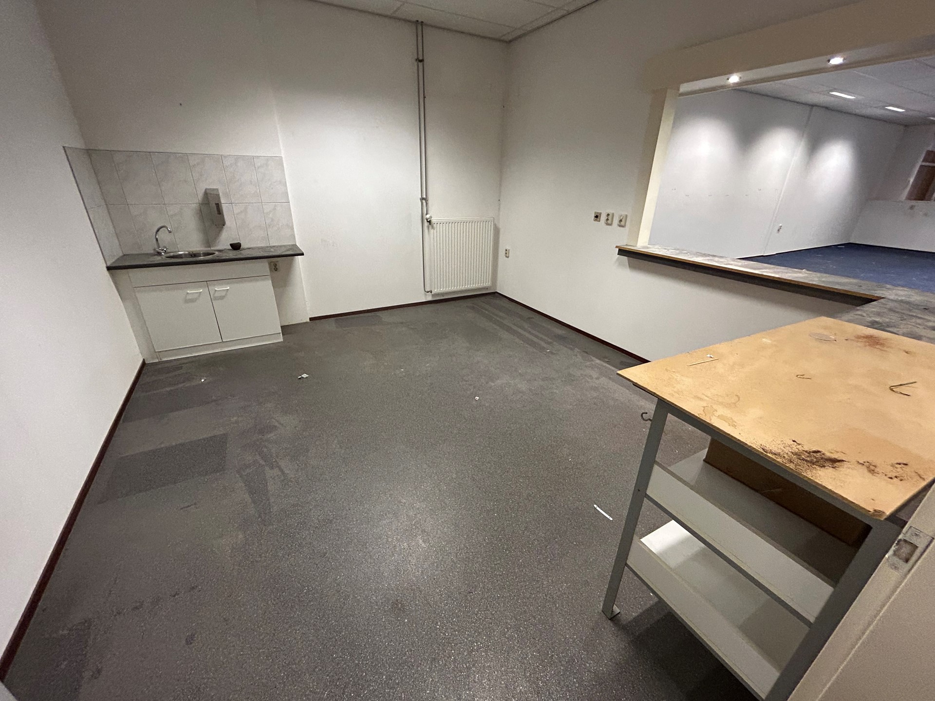 Pantry 4,40 x 3,95 met novilon, systeemplafond met verlichting en aanrechtblok met spoelbak.
