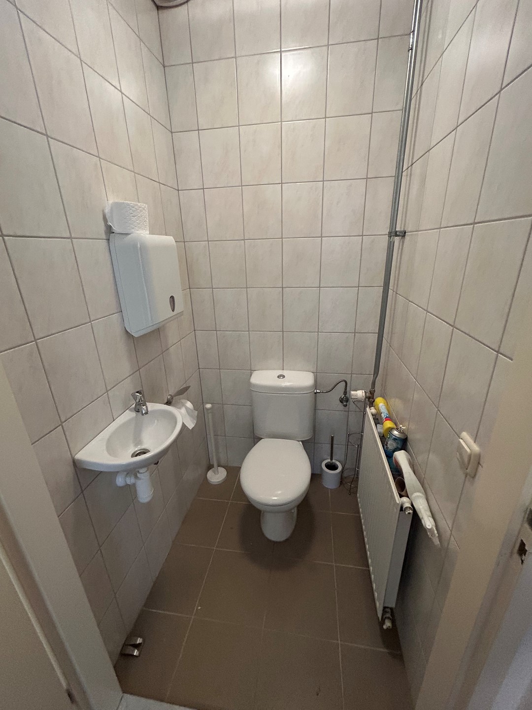 Toilet 1,20 x 1,10 met plavuizenvloer, duoblok en wastafel.