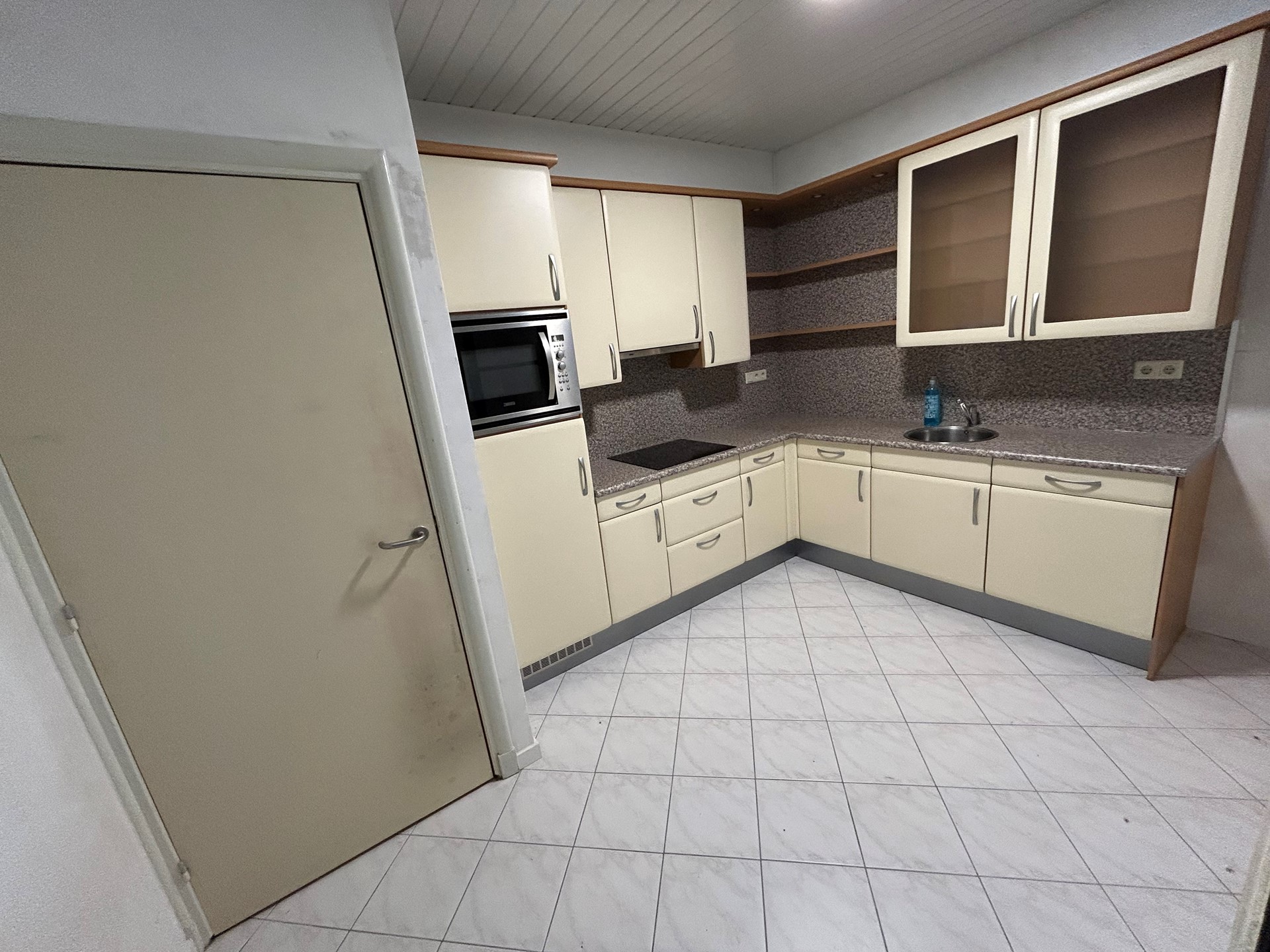 Keuken 3,80 x 2,65 met plavuizenvloer, aanbouwkeuken met elektrische kookplaat met afzuigunit, koelkast met vriesvakje, magnetron en spoelbak.