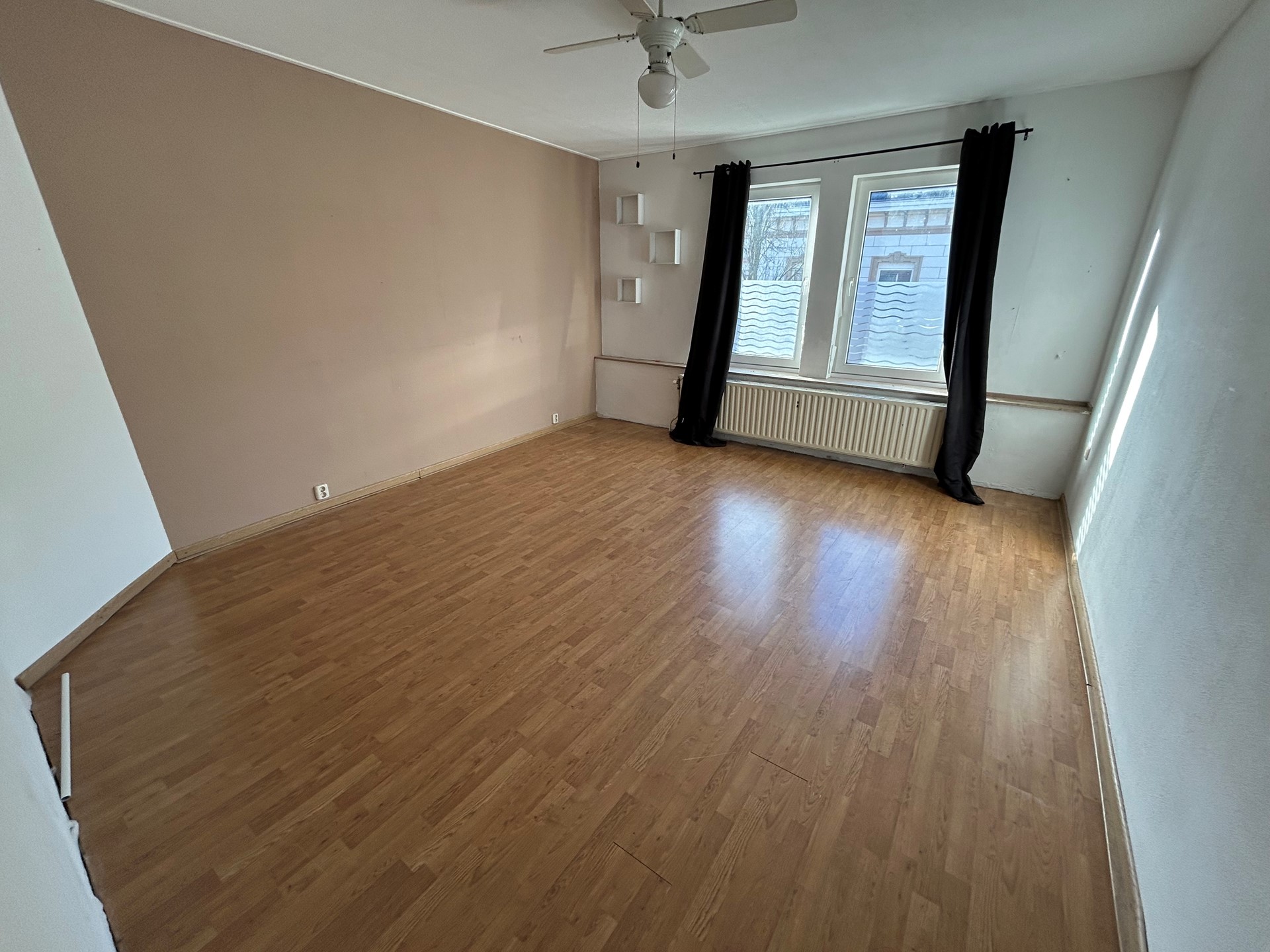Woonkamer 8,90 x 4,70 met laminaatvloer en airco.