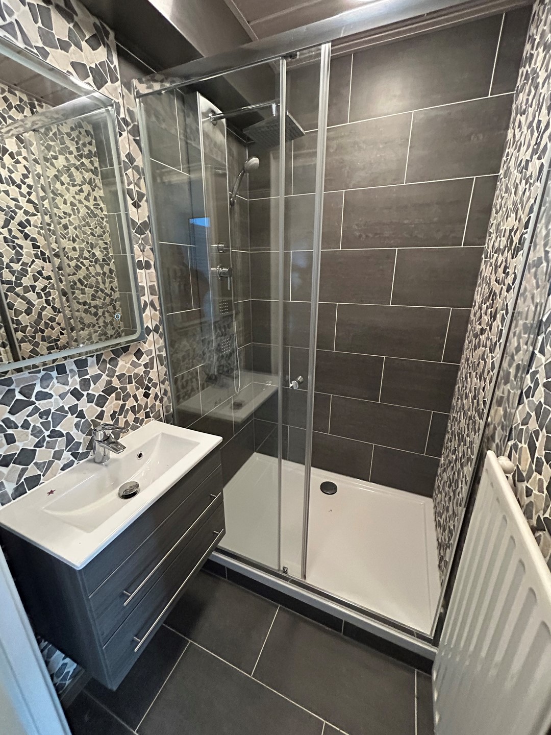 Badkamer 1,60 x 1,30 met plavuizenvloer, inloopdouche en badkamermeubel met keramische wastafel.