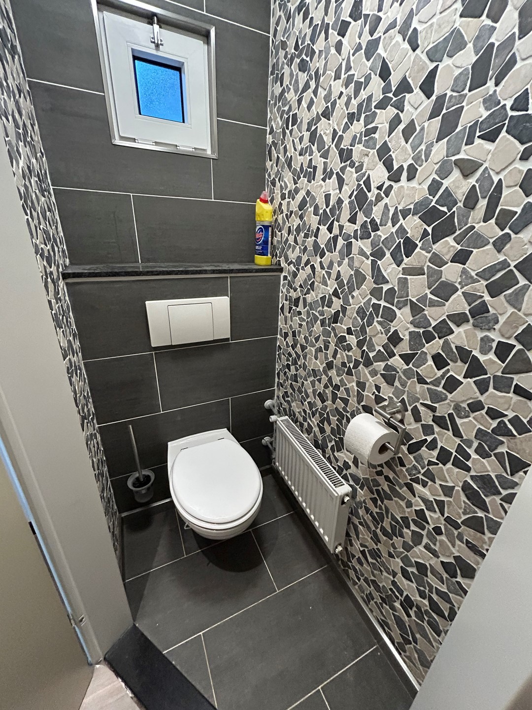 Toiletruimte 1,35 x 0,85 met plavuizenvloer en hangtoilet.