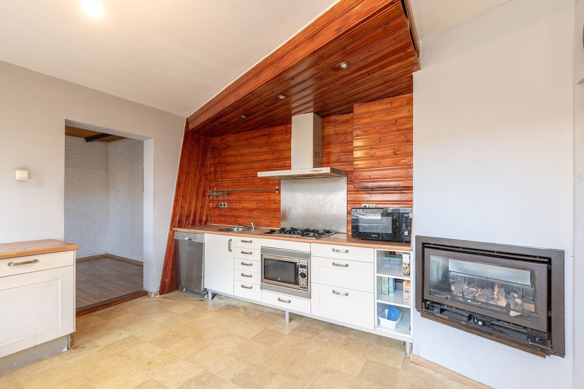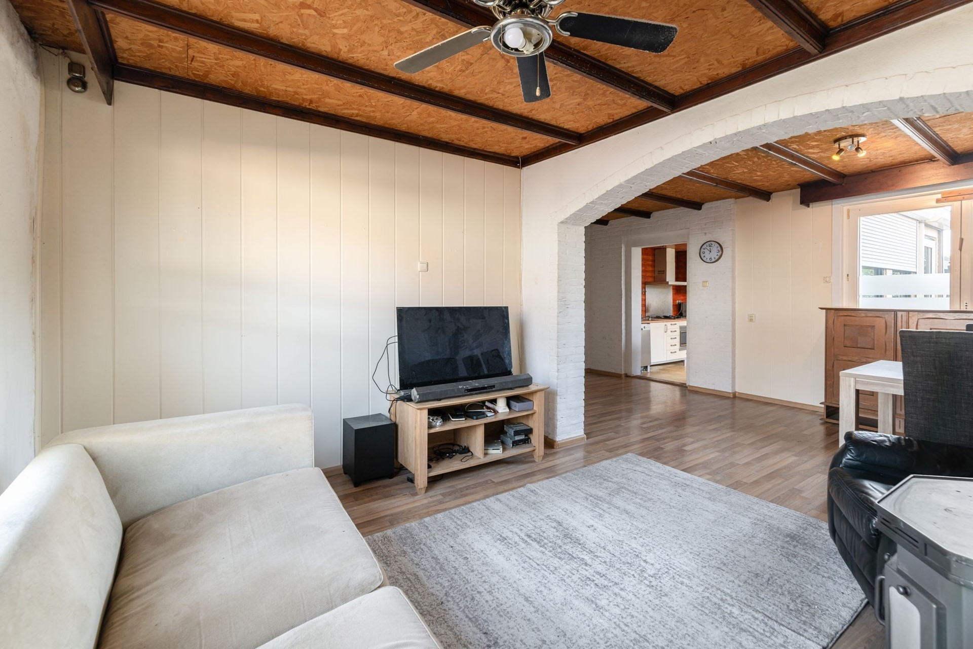 Woonkamer met laminaatvloer en gashaard.