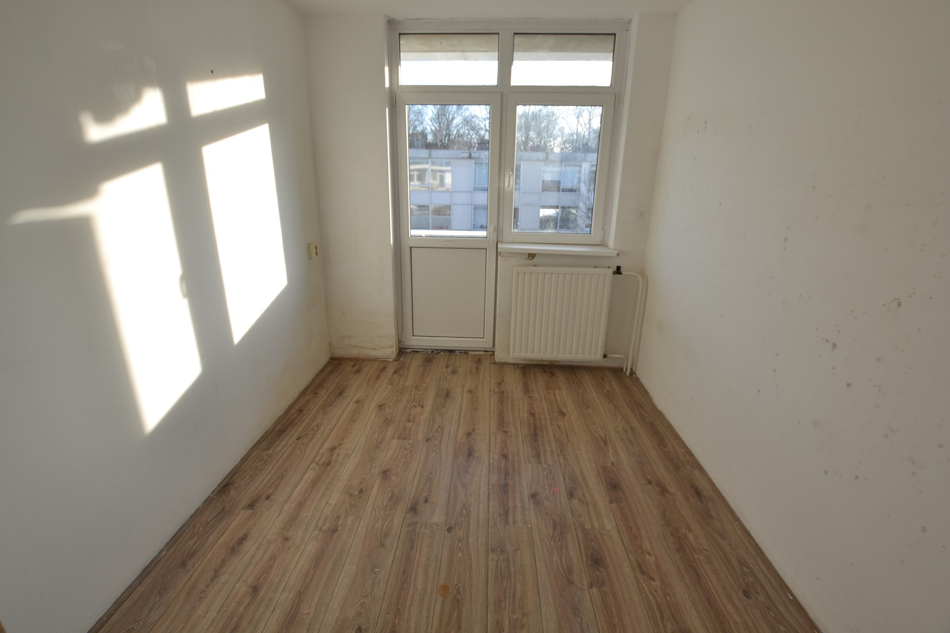 Slaapkamer 4: 3,05 x 2,55 met laminaatvloer en deur naar balkon.