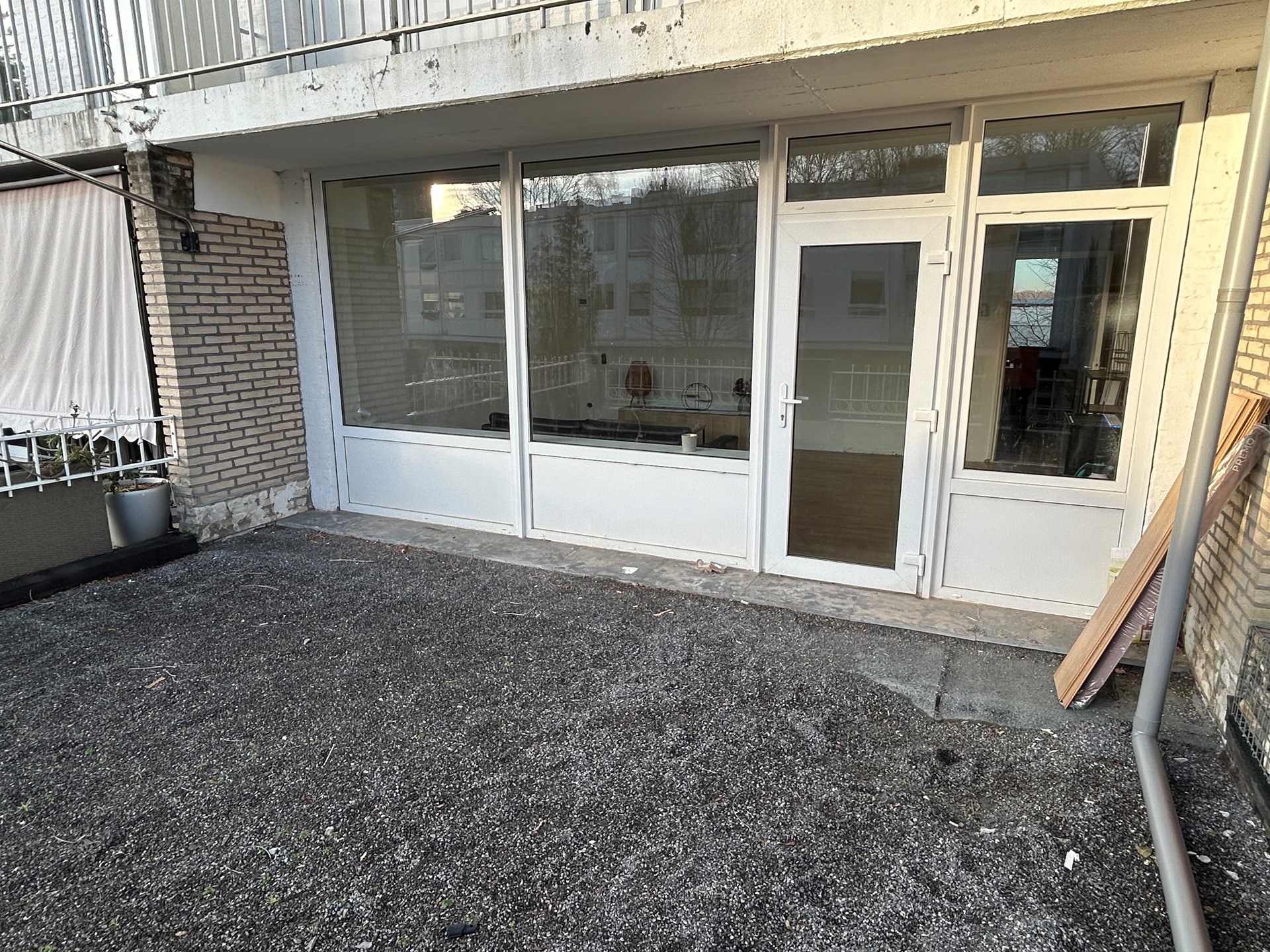 Woonkamer 5,70 x 3,95 met laminaatvloer en deur naar betegeld dakterras 5,70 x 4,70 met hekwerk.