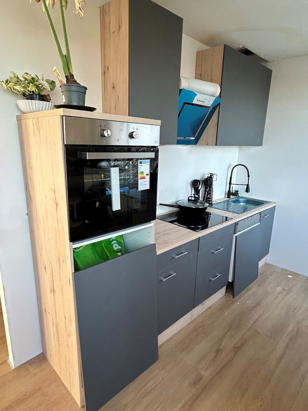 Keuken 5,70 x 3,40/2,20 met laminaatvloer en aanbouwkeuken met elektrische kookplaat met RVS afzuigunit, bakoven, vaatwasser, koel/vriescombinatie en spoelbak.