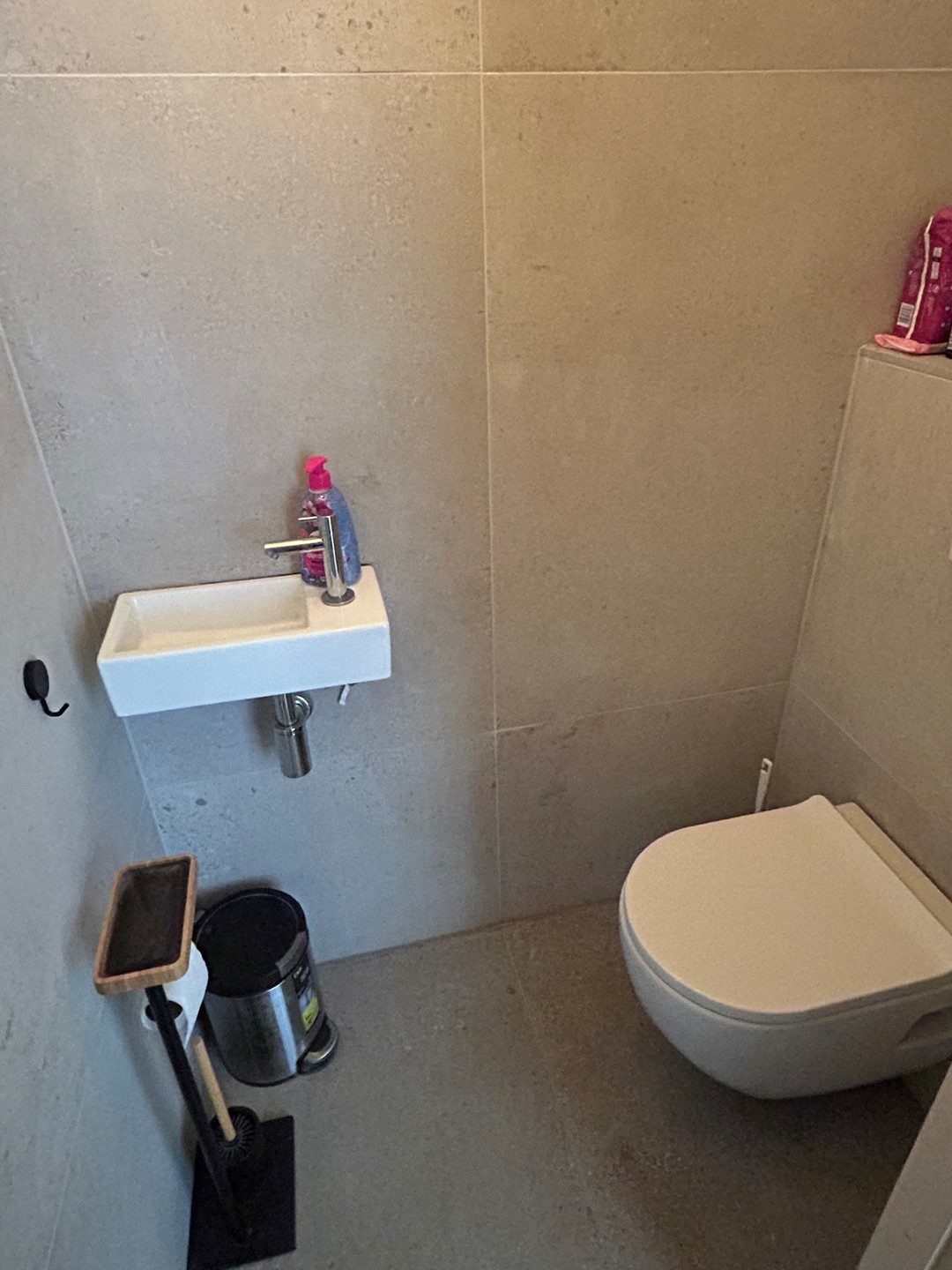Toiletruimte 1,40 x 0,85 met plavuizenvloer, duoblok en fonteintje.
