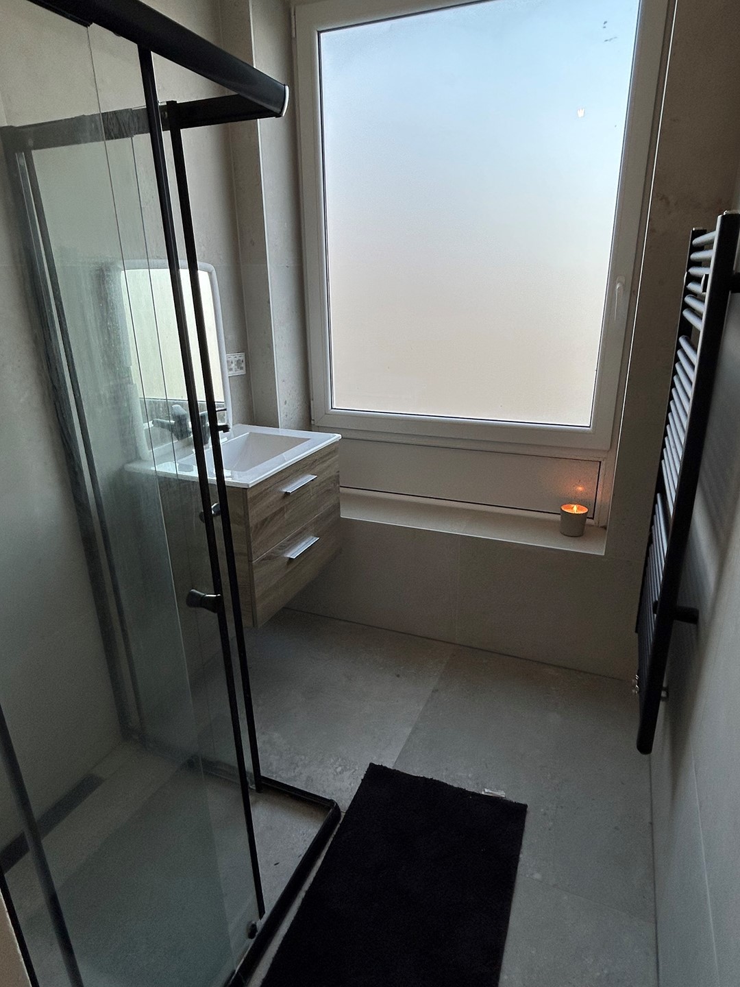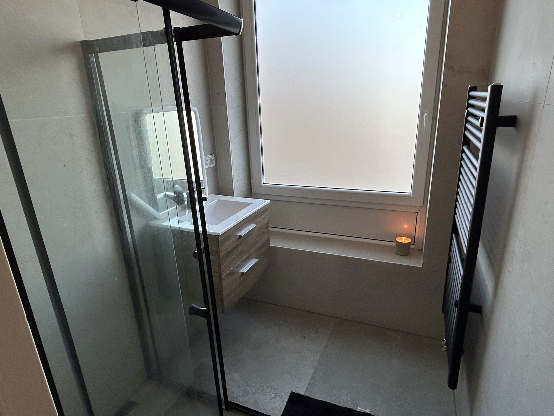 Badkamer 1,85 x 1,70 met plavuizenvloer, douche met cabine en badkamermeubel met wastafel.