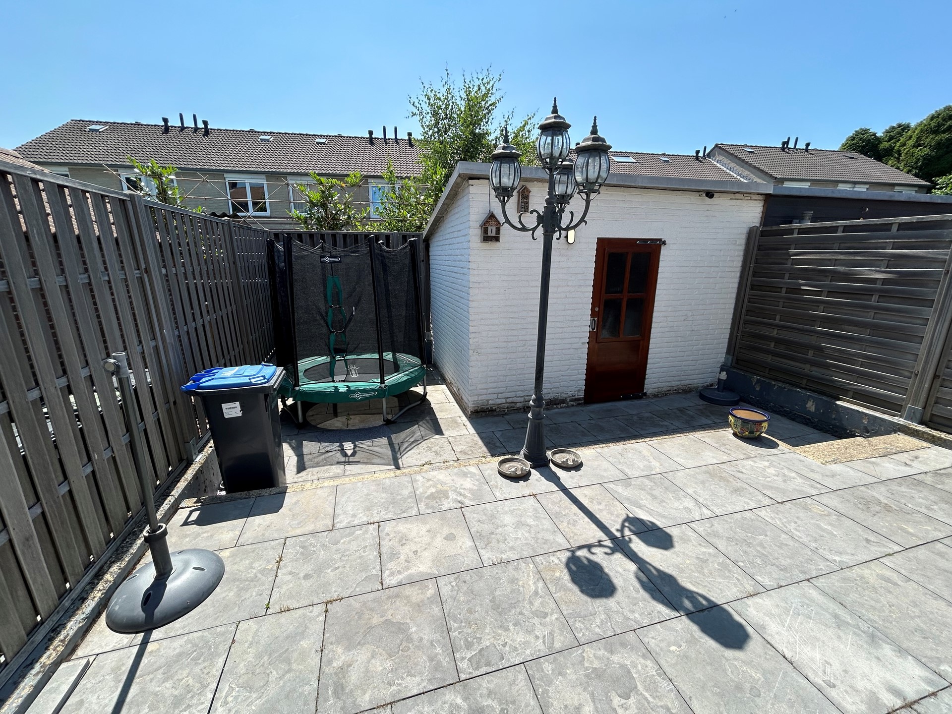 Achtertuin 11,00 x 6,10 met terras, bestrating, stenen berging 3,60 x 2,50 met elektriciteit, prieeltje 3,70 x 2,80 met zonwering en deur naar oprit.