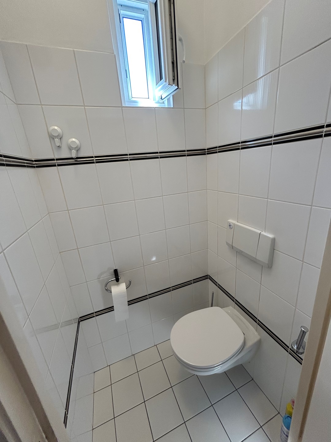 Toiletruimte 1,10 x 0,90 met plavuizenvloer en hangtoilet.