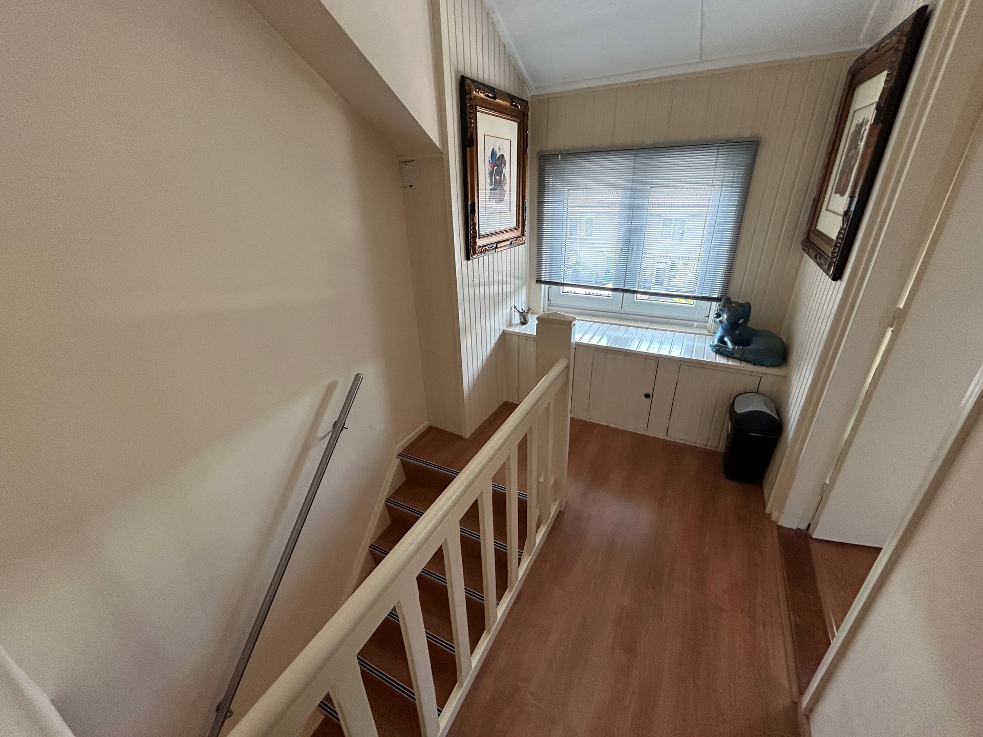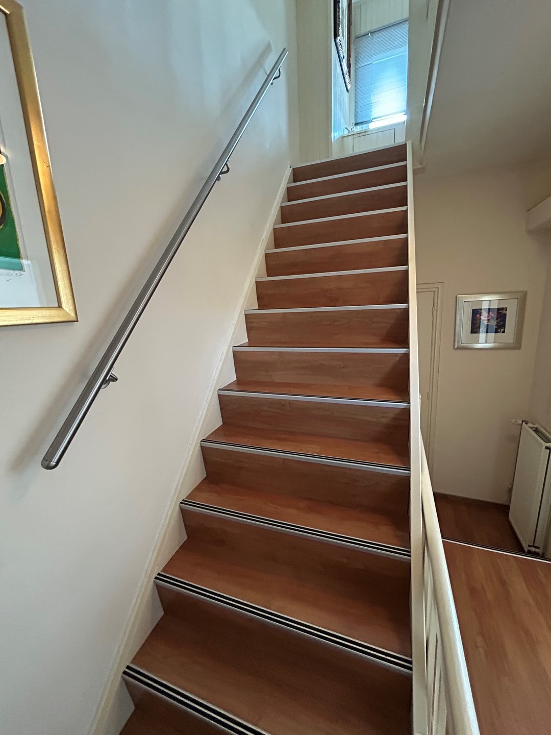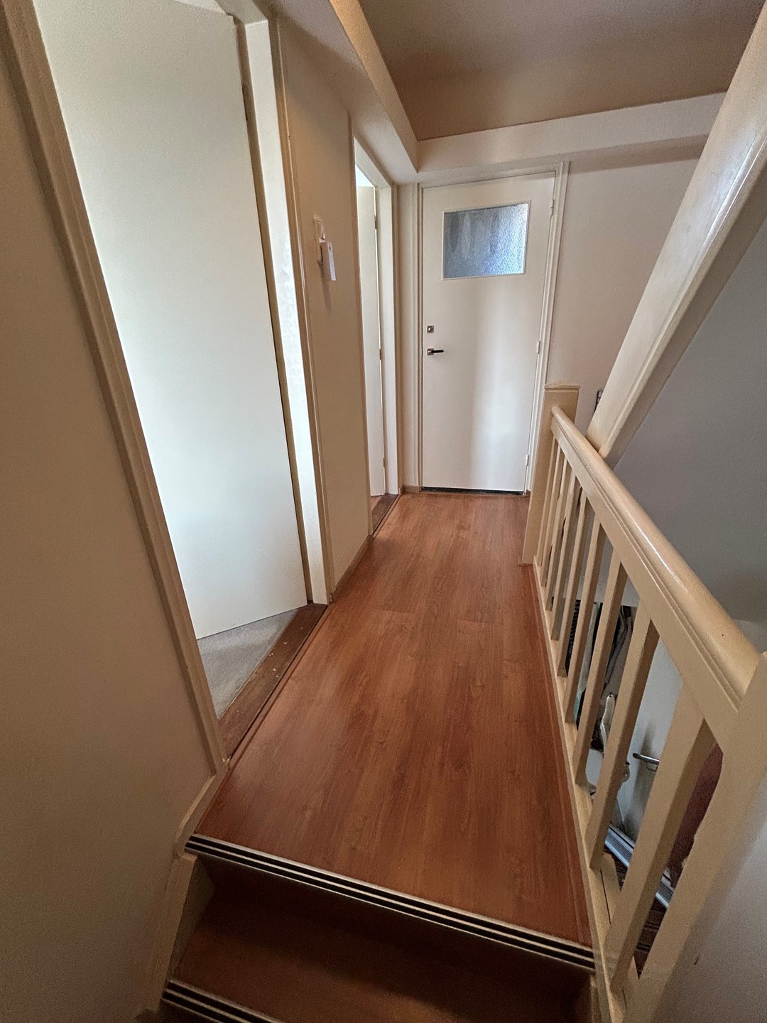 Overloop 3,70 x 0,95 met laminaatvloer en vaste trap naar tweede verdieping.
