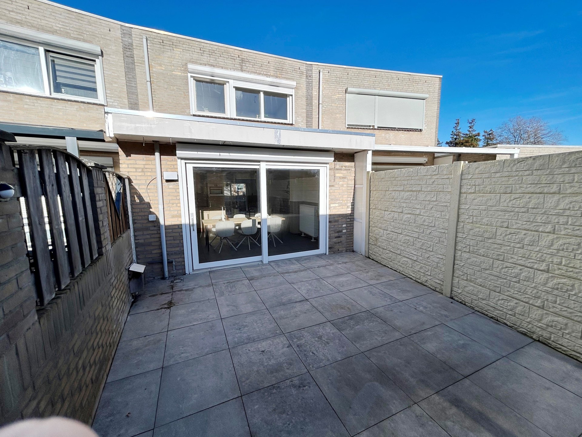 Achtertuin is eveneens geheel bestraat en voorzien van muren, houten schutting, verlichting, kraan en deur naar garage.