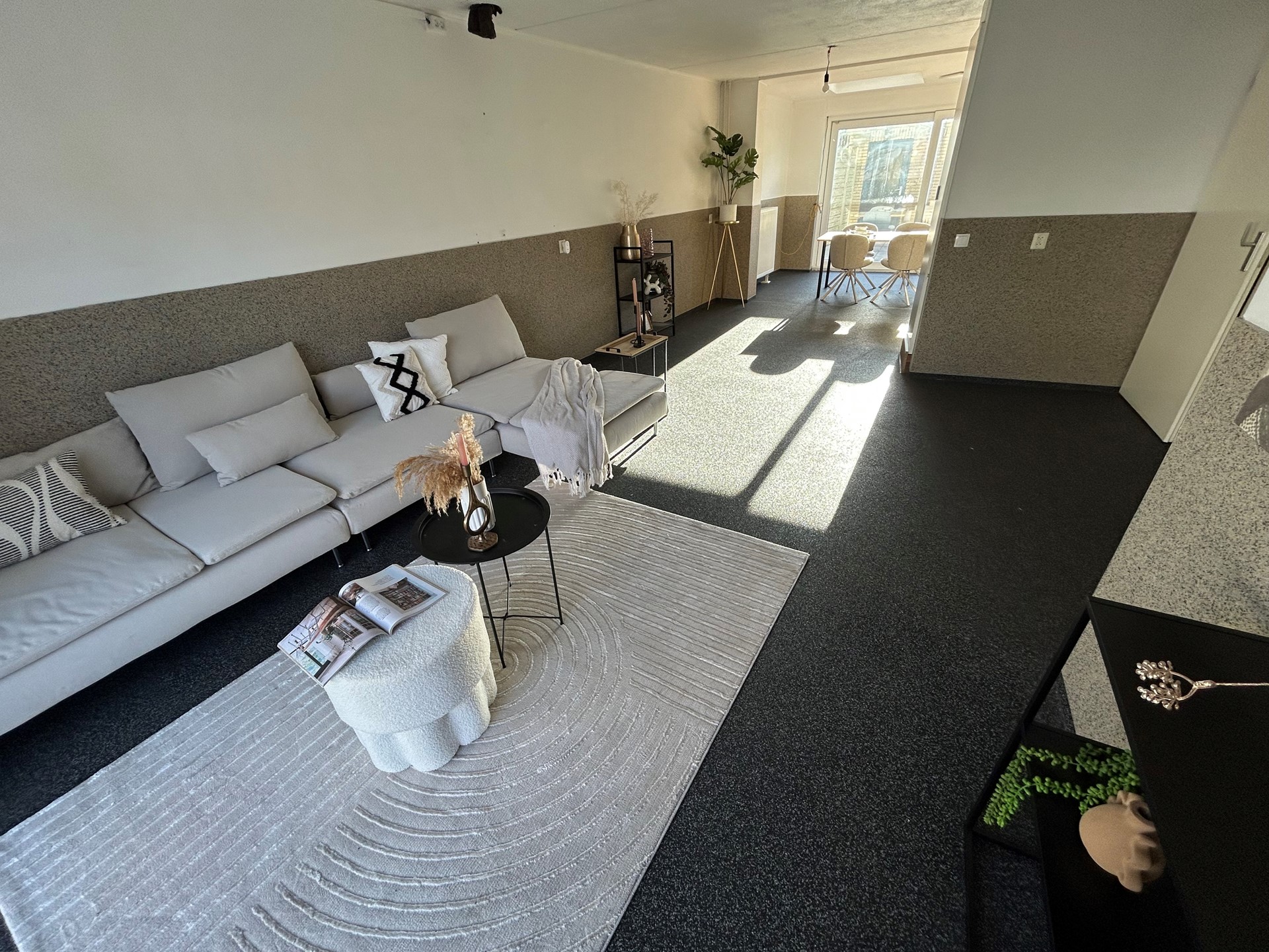 Ruime zonnige woonkamer 7,45 x 4,35/3,65/2,75 met siergrindvloer, berging onder trap naar verdieping, schuifpui naar patiotuin en open keuken.