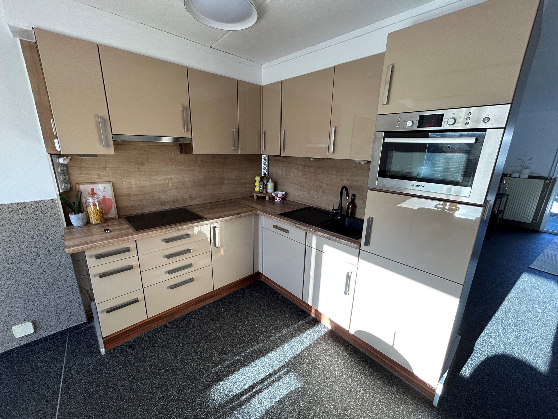 Keuken 2,35 x 2,10 met siergrindvloer en hoogglans aanbouwkeuken met elektrische kookplaat met afzuigunit, vaatwasser, koelkast, magnetron, draaideurcarrousel en spoelbak.