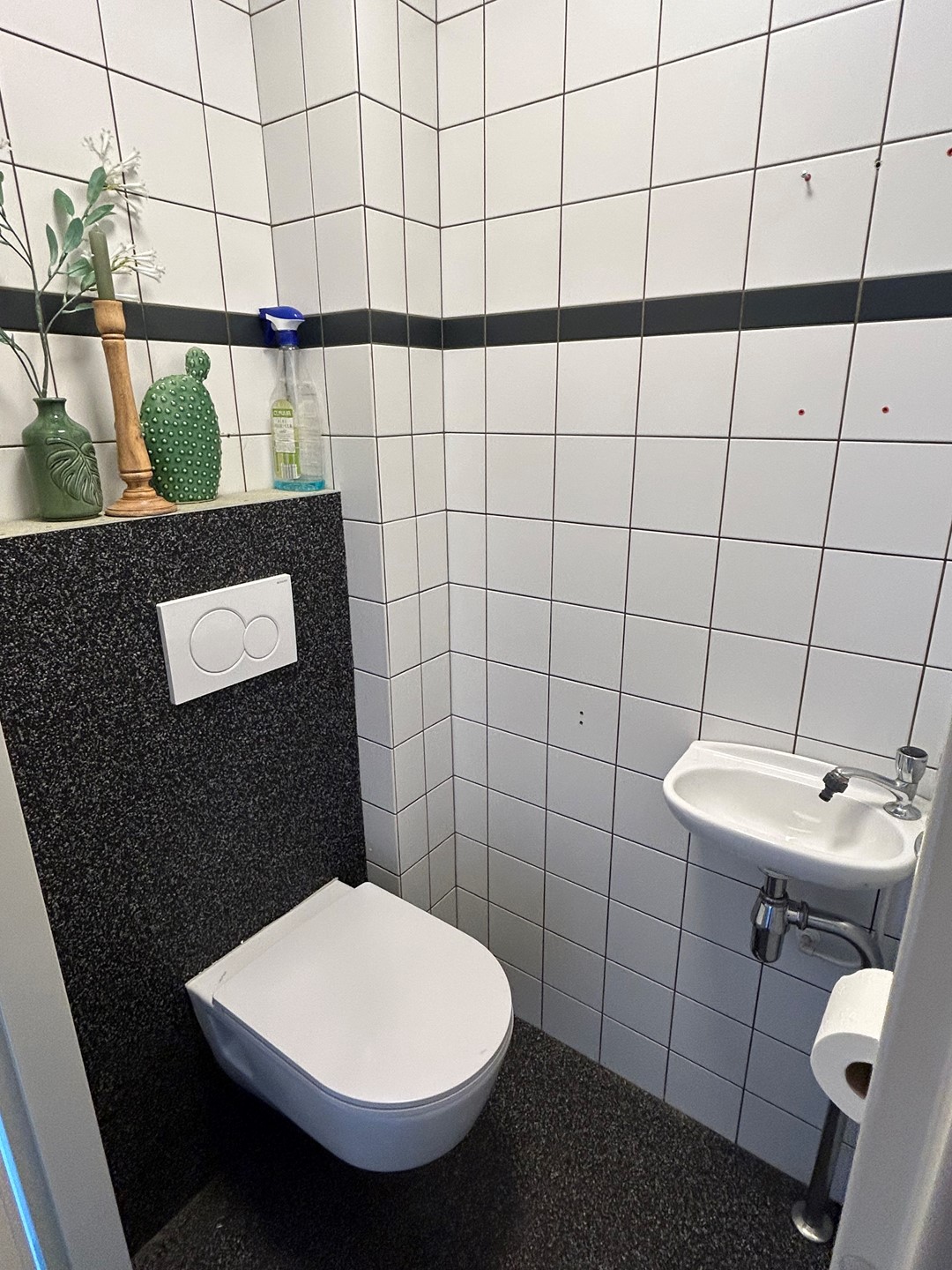 Gastentoilet 1,20 x 0,90 met siergrindvloer, hangtoilet en fonteintje.