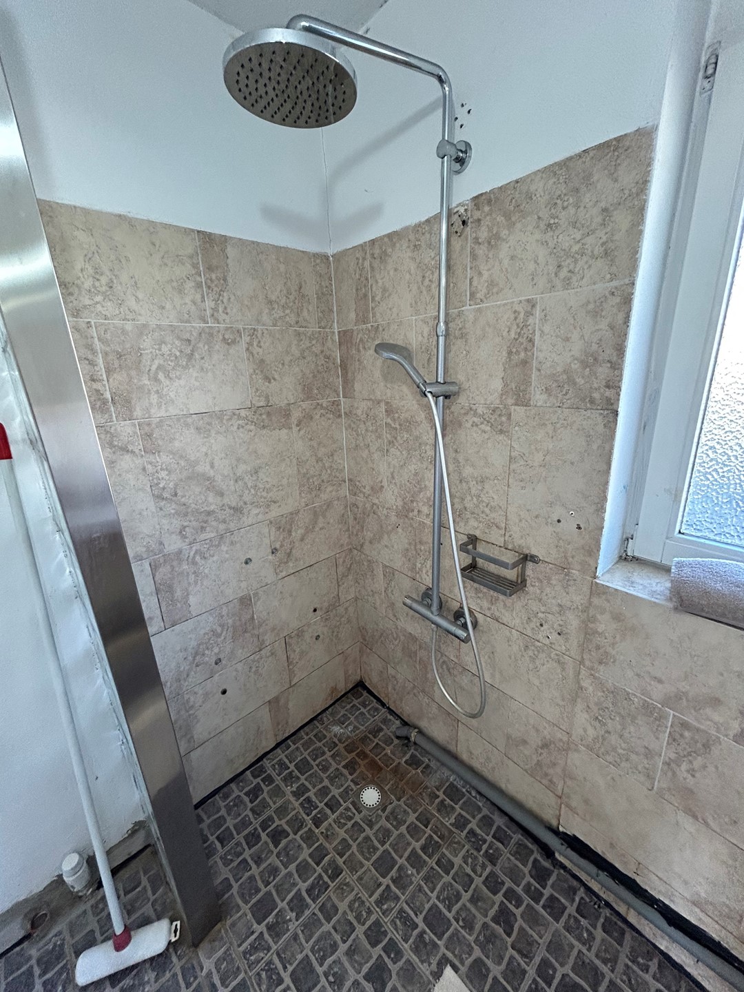 Badkamer 2,10 x 2,05 met tegelvloer, inloopdouche en badkamermeubel met 2 wastafels (dient gerenoveerd te worden).