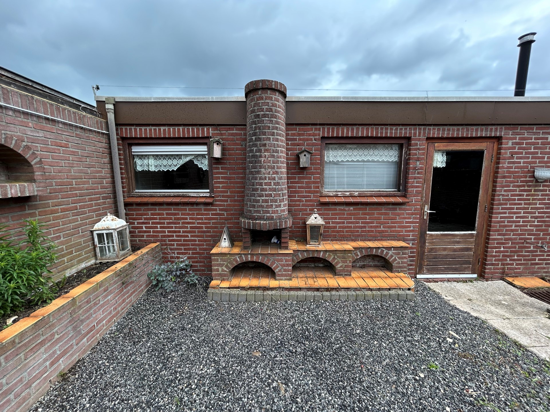 Achtertuin met terras, beplanting, siergrind, buitenberging 8,15 x 2,85, barbeque, overkapping 2,70 x 1,35 met deur naar brandpad, verlichting, kraan en elektriciteit.