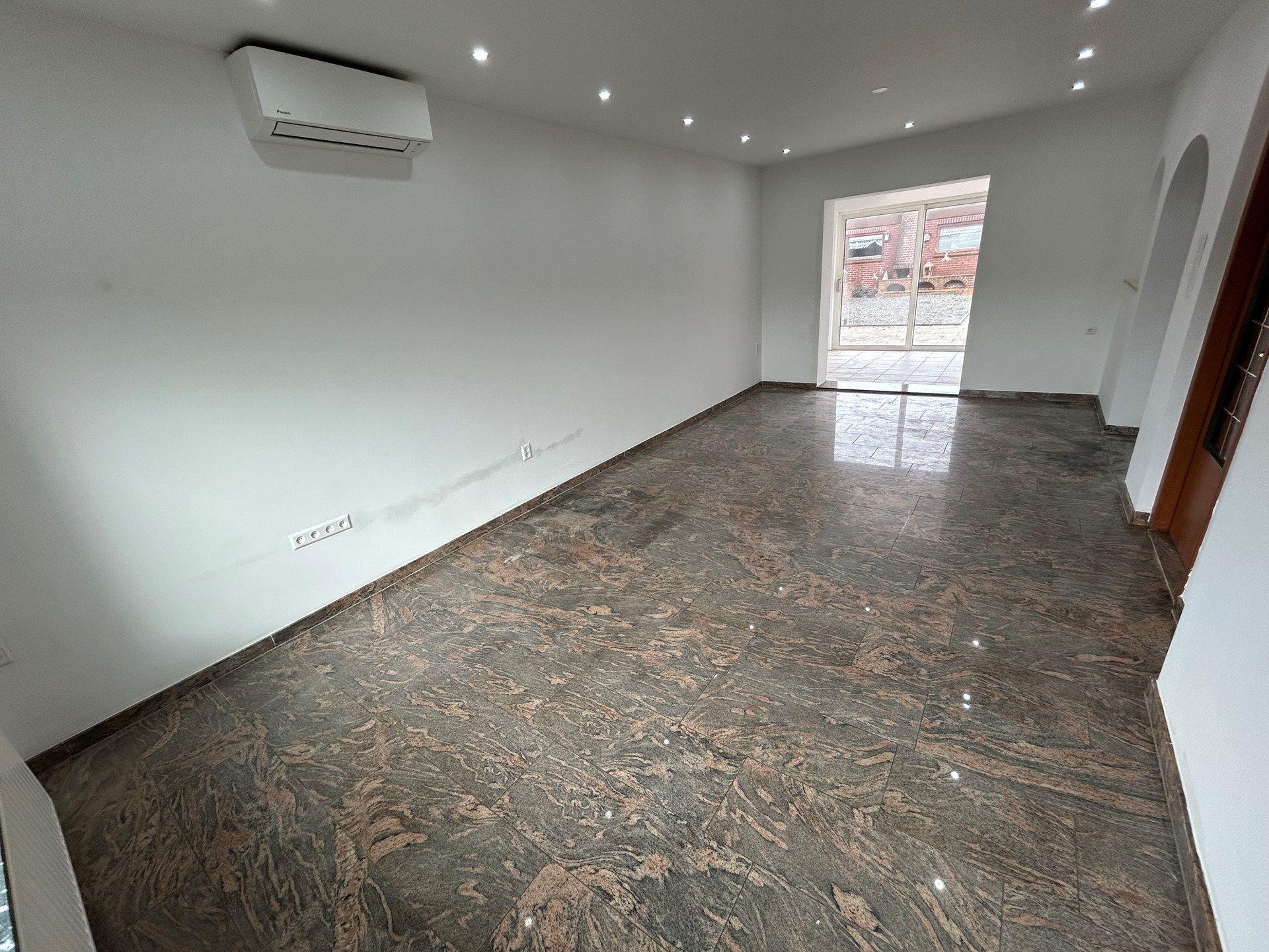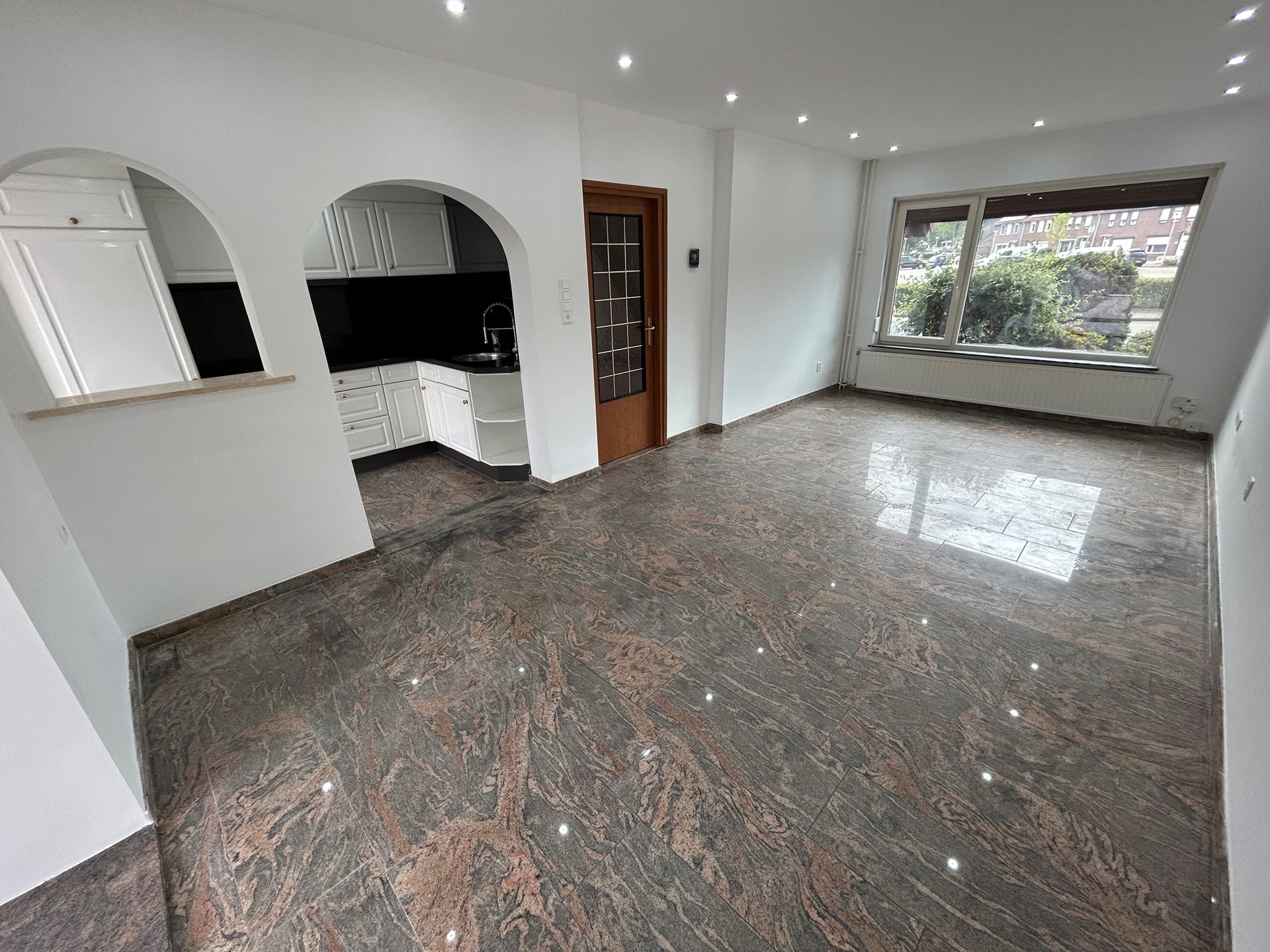 Woonkamer 6,80 x 3,40 met granieten vloer, inbouwspots, airco (warm/koud), doorgang naar aanbouw en half open keuken.