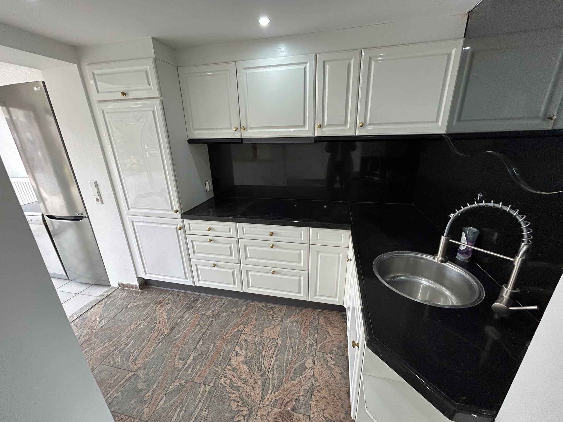 Keuken 3,05 x 1,75 met granieten vloer, inbouwspots, hoogglans aanbouwkeuken met granieten werkblad en achterwand, inductie kookplaat met nieuwe afzuigunit, draaideurcarrousel, losse vaatwasser, losse koel/vriescombinatie en spoelbak.