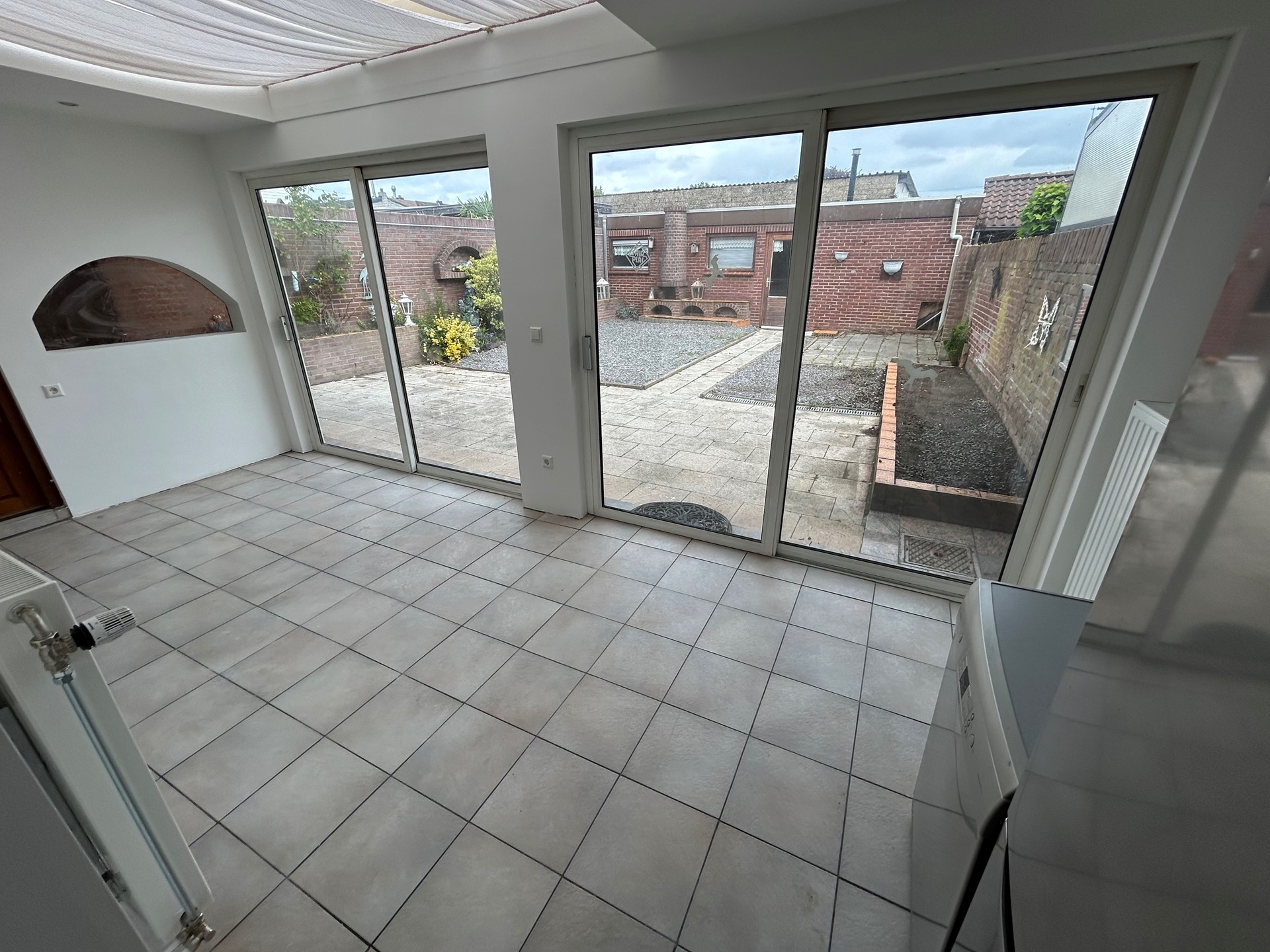 Aanbouw 5,60 x 2,40 met plavuizenvloer, 2 schuifpuien naar achtertuin en deur naar garage.