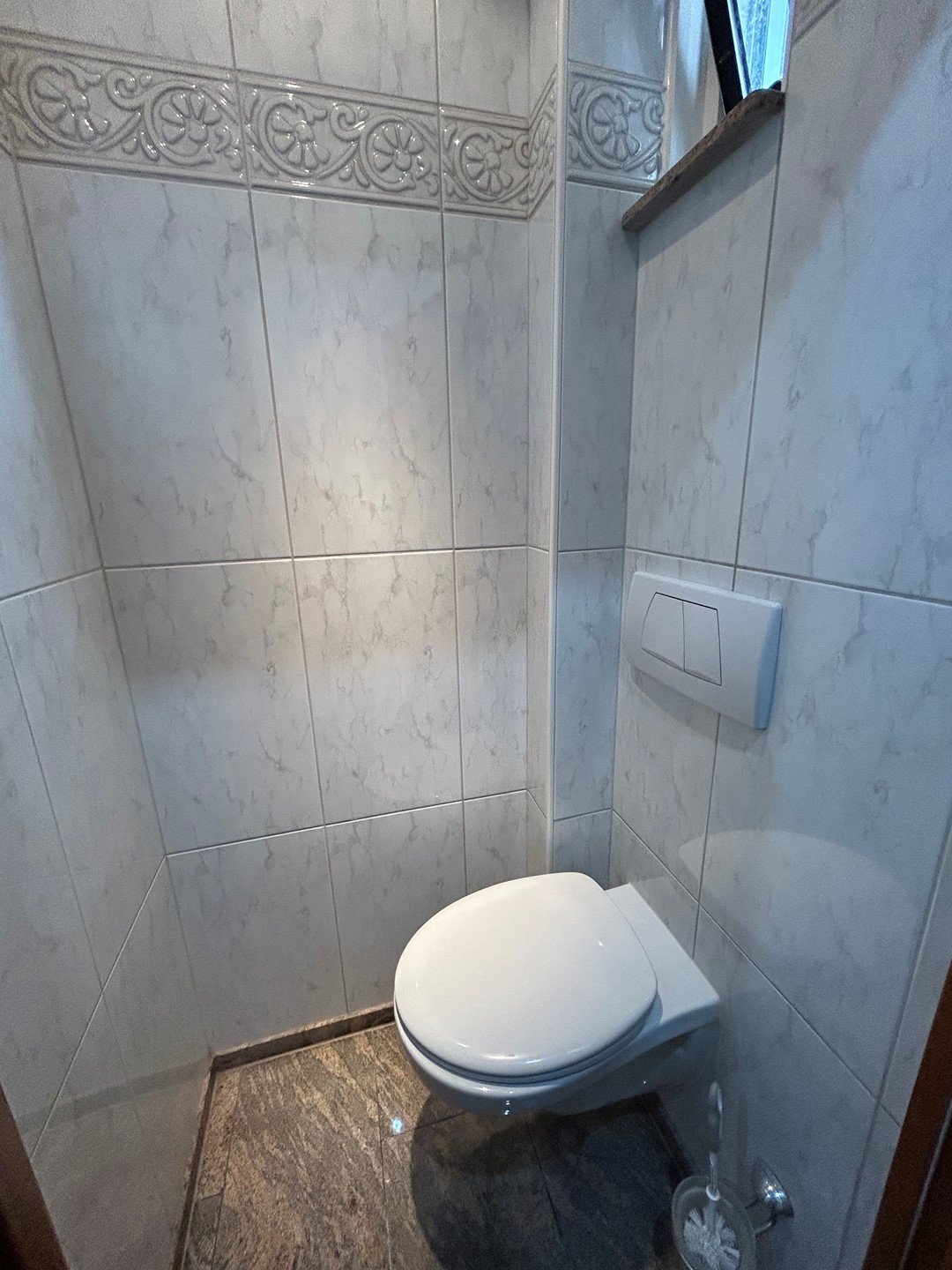 Entree/gang 4,00 x 1,00 met granieten vloer, inbouwspots, gastentoilet 0,95 x 0,80 met granieten vloer en hangtoilet, deur naar woonkamer en kelder en trap naar eerste verdieping.