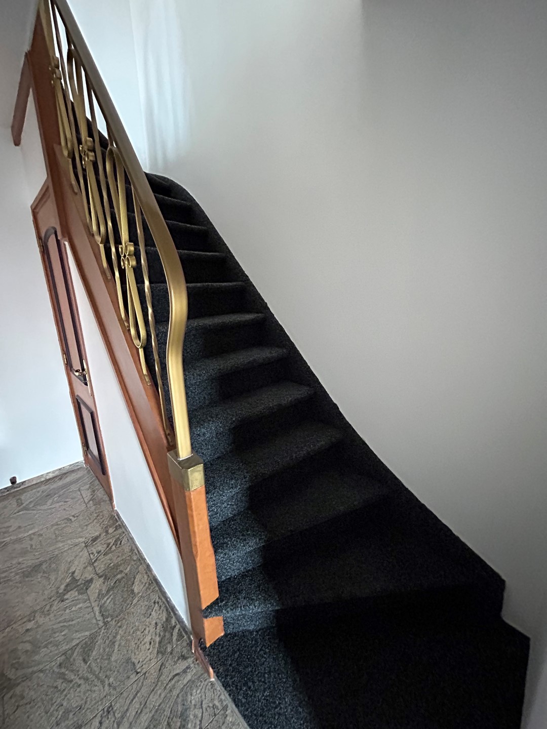 Overloop 2,50 x 0,80 met granieten vloer en vaste trap naar zolderverdieping.