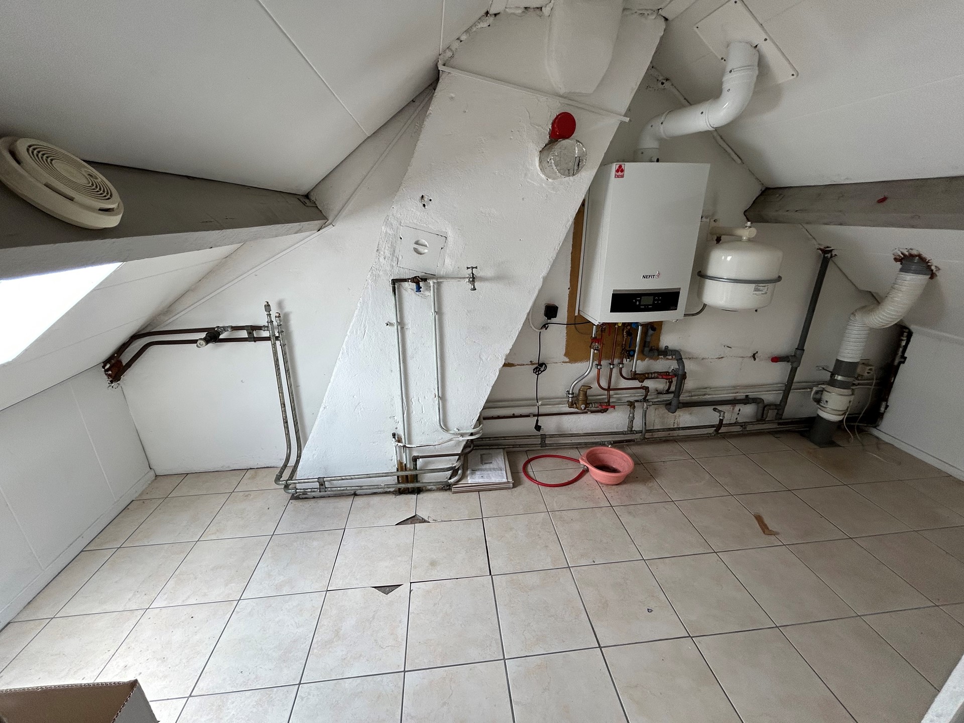 Stookruimte 2,25 x 1,85 met plavuizenvloer, dakraam en cv-combiketel Nefit Trendline HRC 30 CW 5 van 2019 (eigendom).