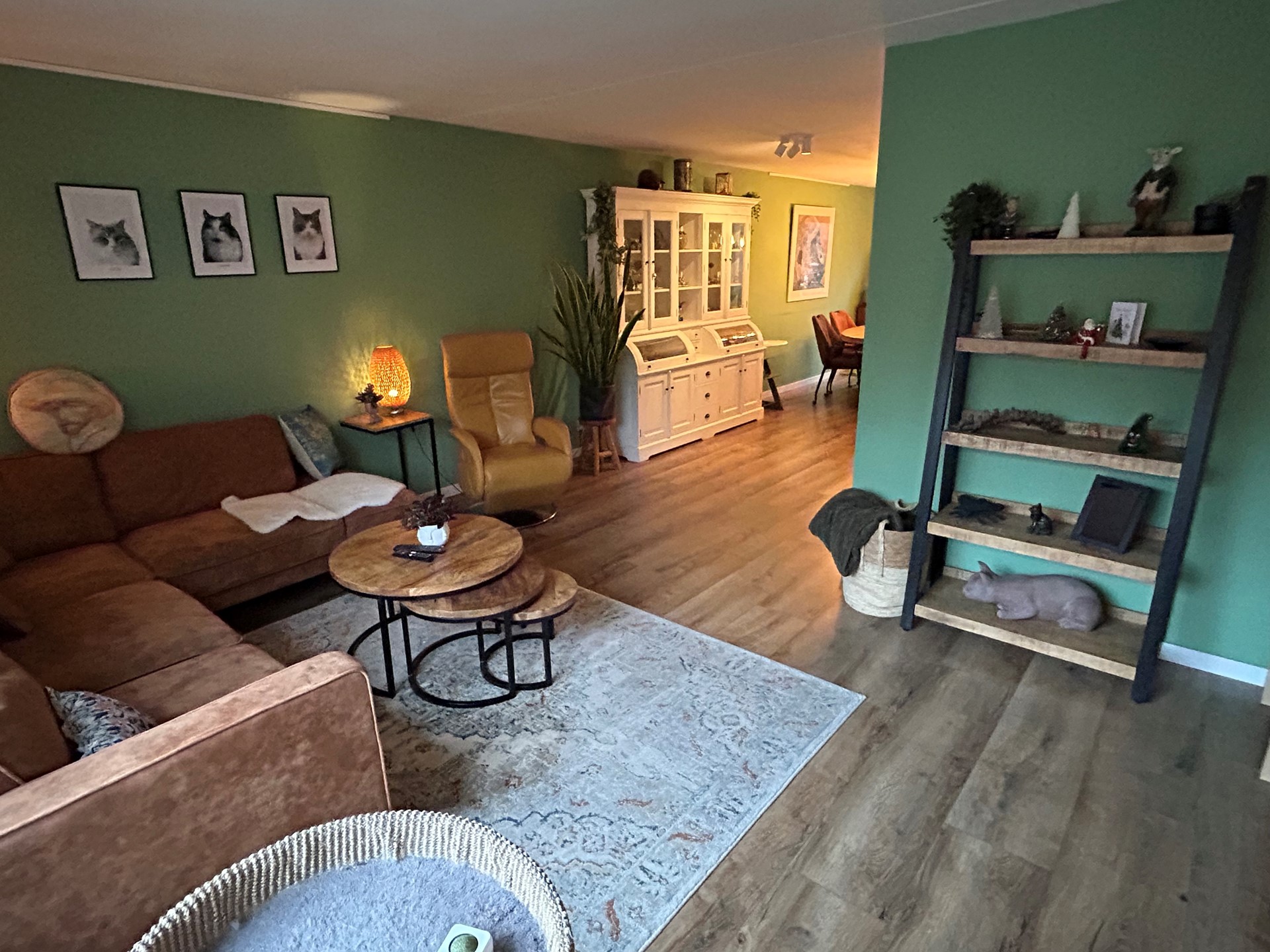 L-vormige woonkamer 10,40 x 5,00/2,75 met laminaatvloer, deur naar achtertuin en open keuken.