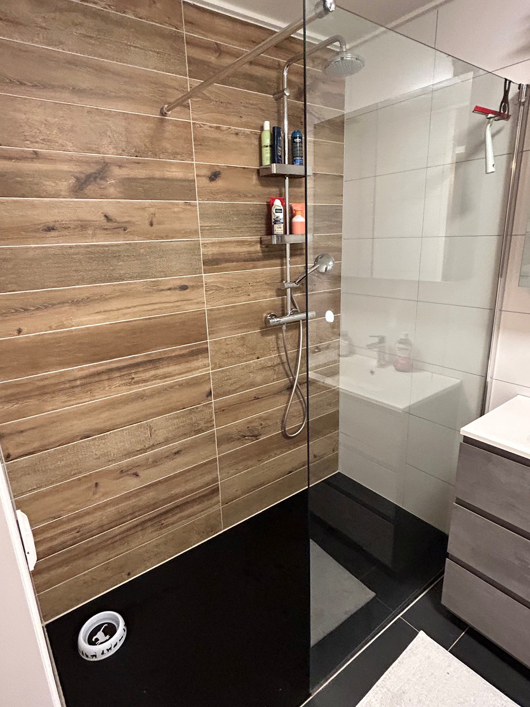 Luxe badkamer 2,85 x 1,75 met plavuizenvloer met elektrische vloerverwarming, inloopdouche, hangtoilet en badkamermeubel met wastafel (2021).