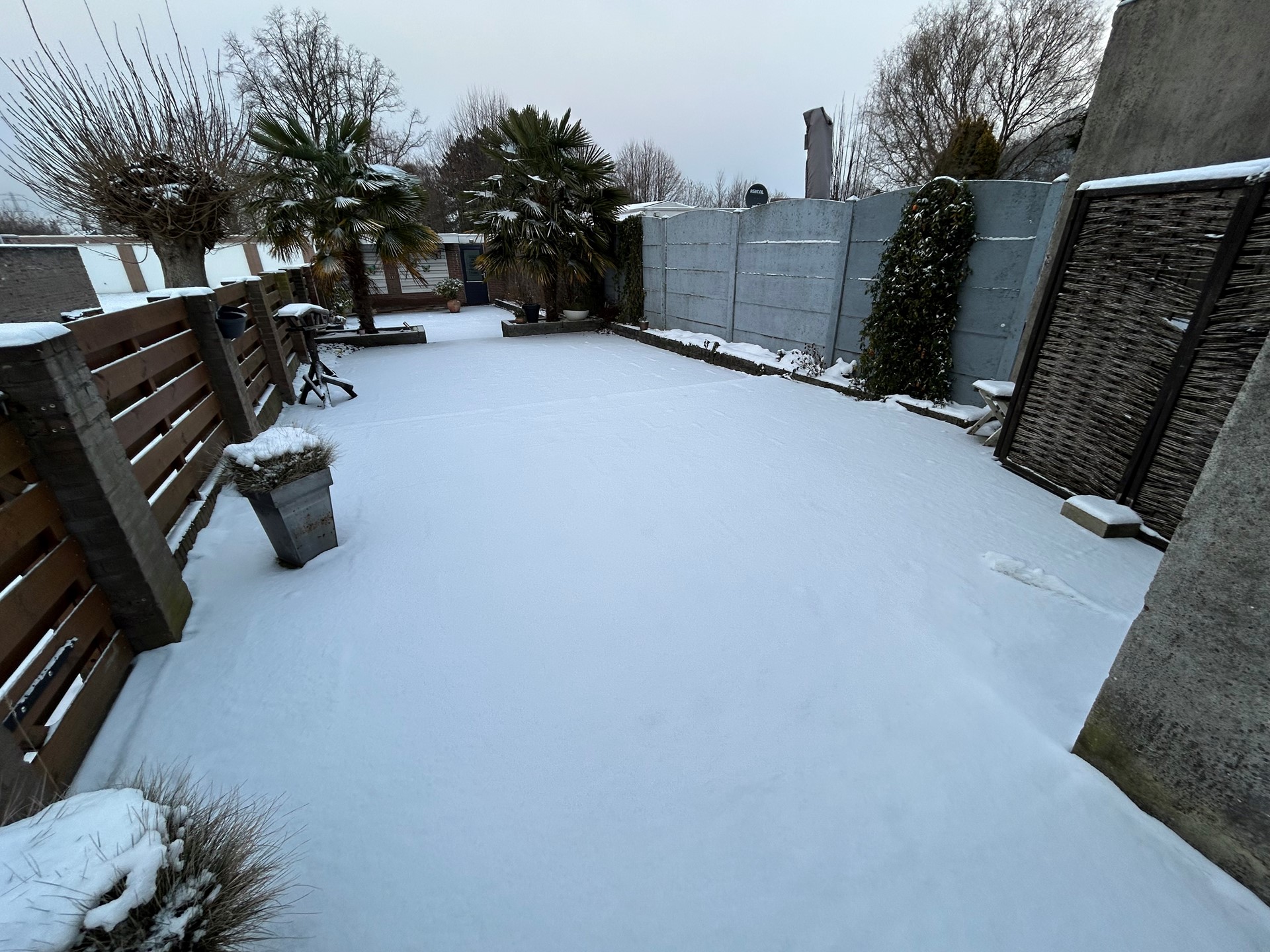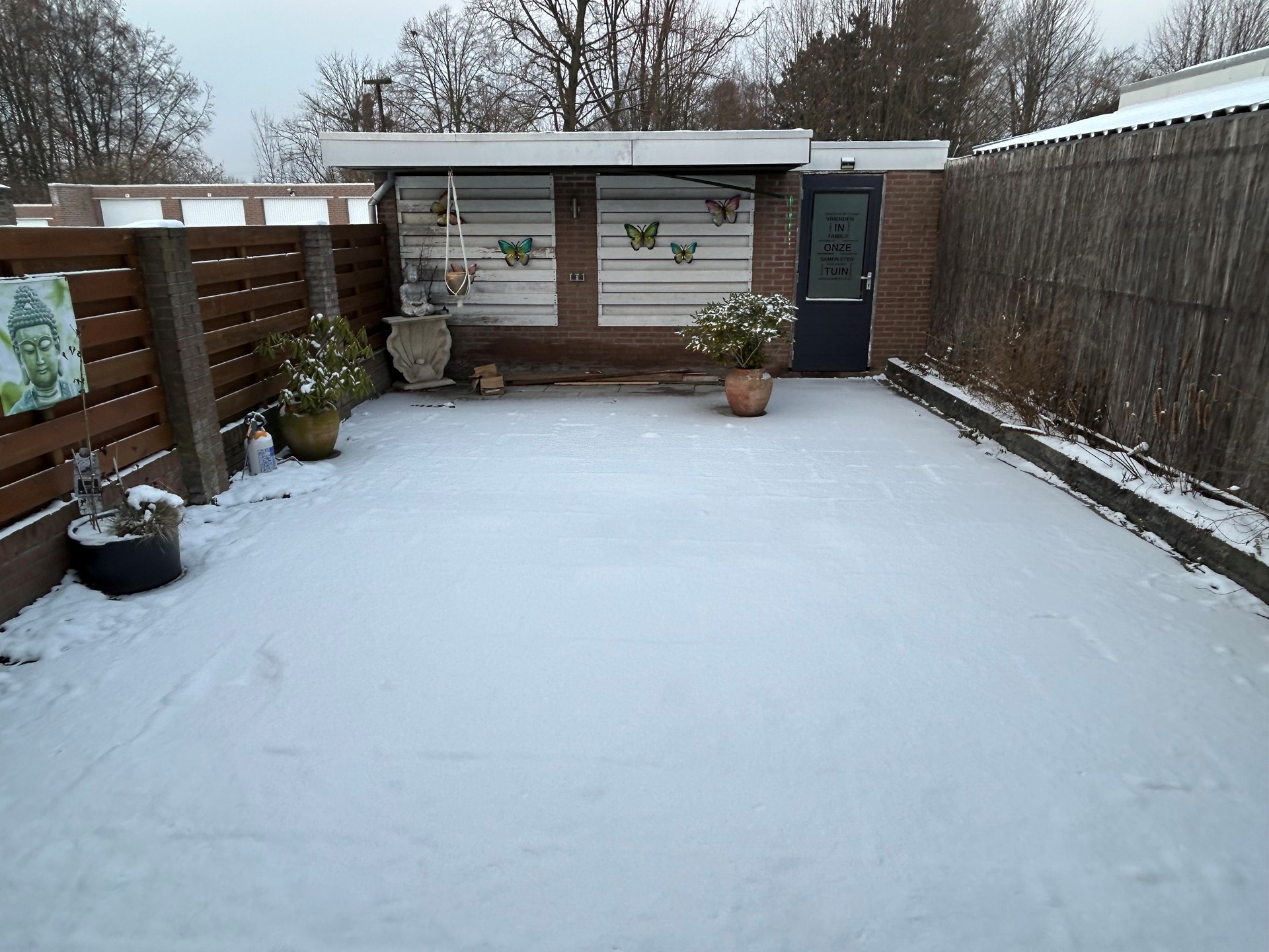 Diepe achtertuin met bestrating, beplanting, schuttingen, buitenberging 2,90 x 1,80 met cv-combiketel Remeha Calenta en vrijstaande garage 5,70 x 3,20 met elektrische poort.