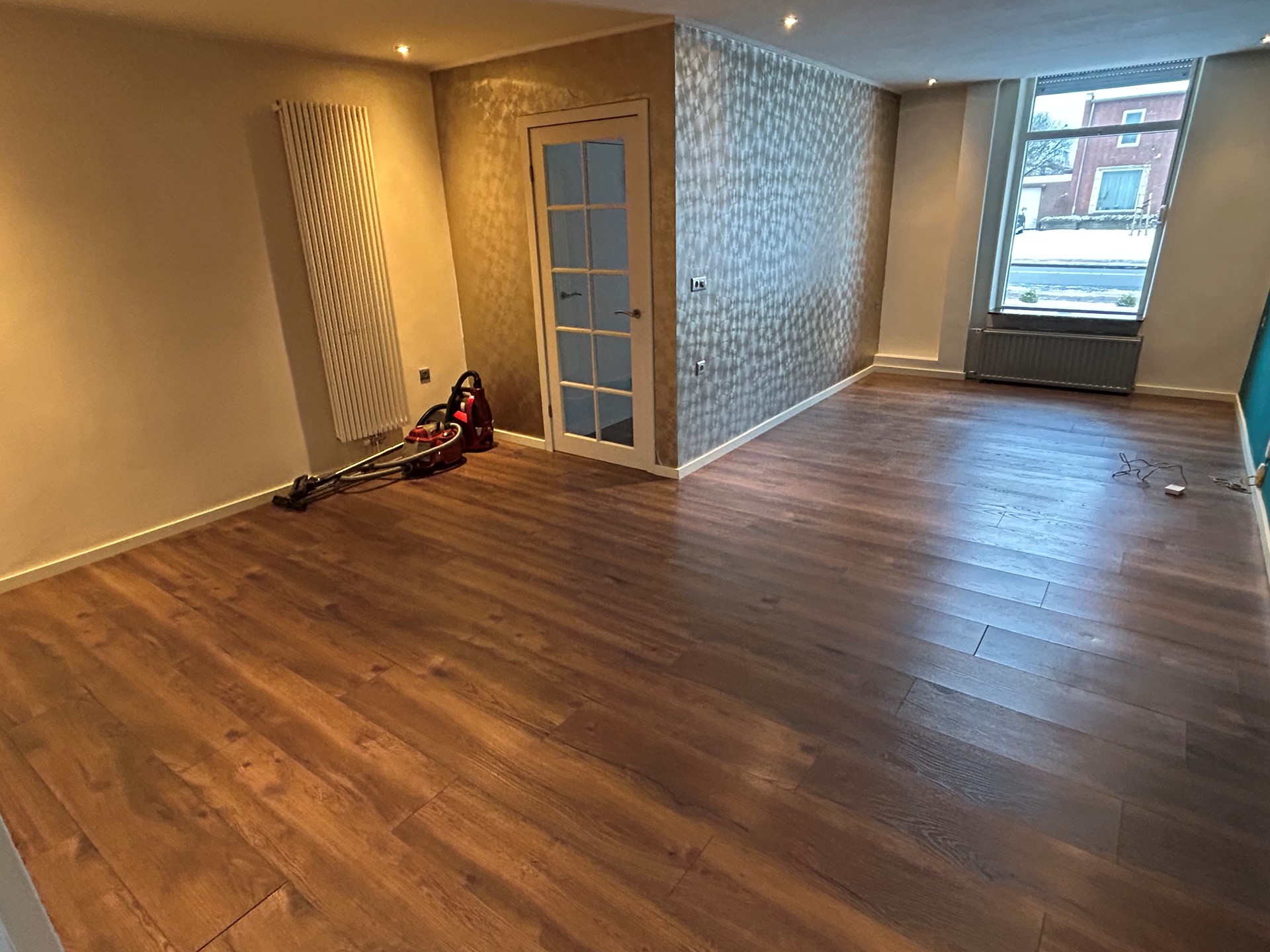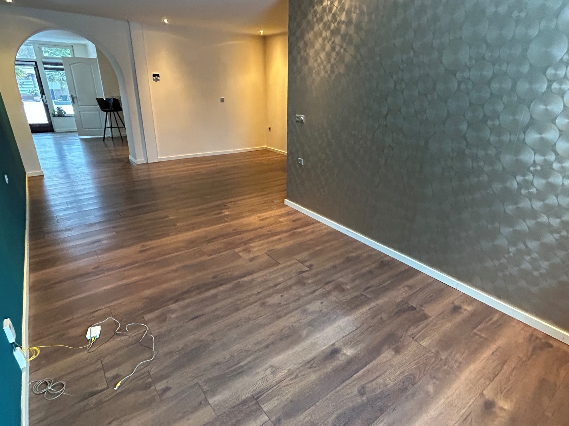 L-vormige woonkamer 7,05 x 4,80/2,85 met laminaatvloer, inbouwspots en doorgang naar keuken.