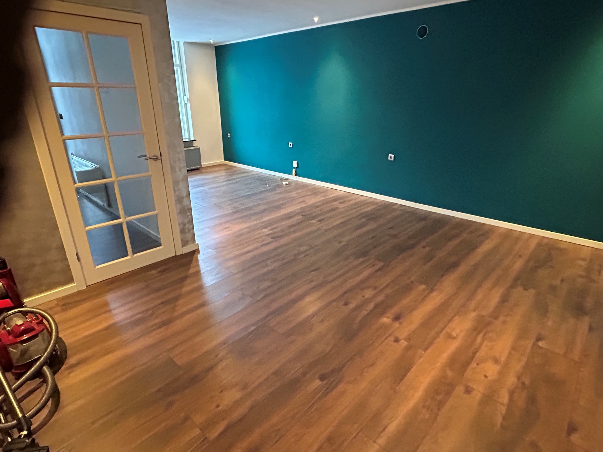 Portaal 1,60 x 1,25 met laminaatvloer, deur naar badkamer en toiletruimte.