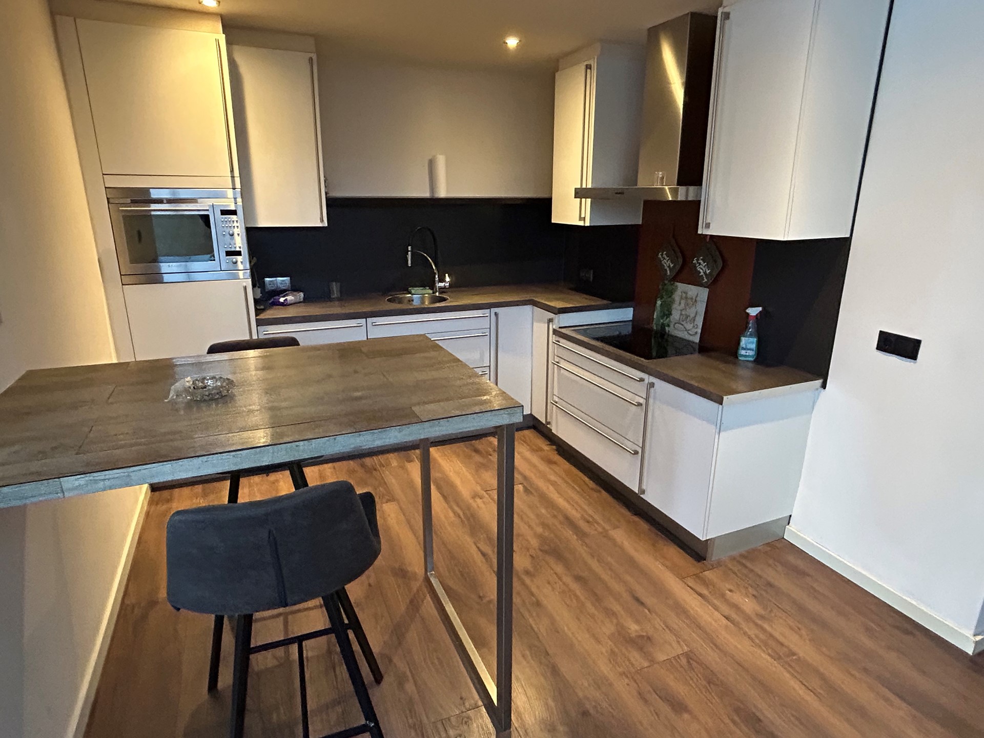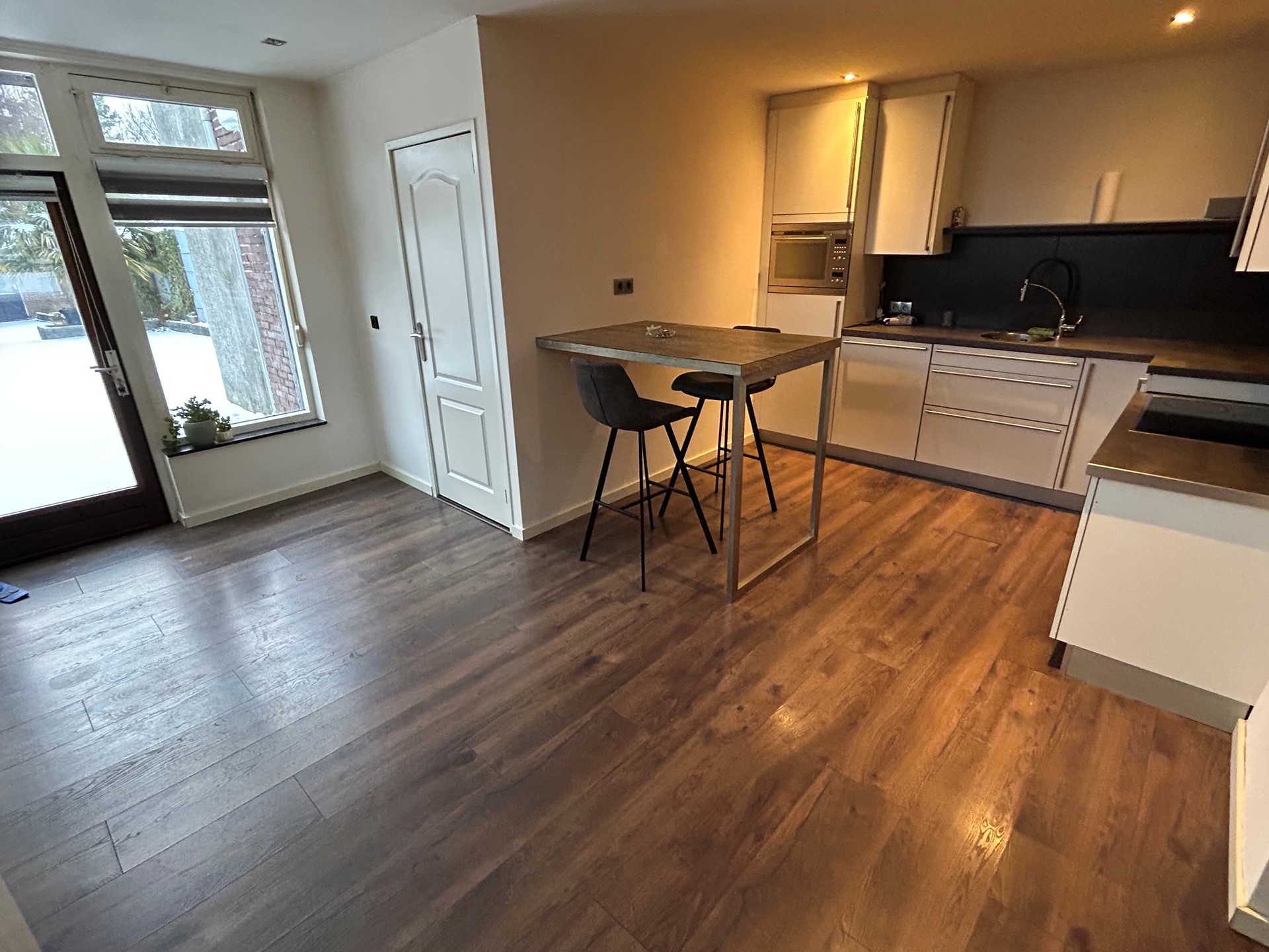 Keuken 5,10 x 3,65/1,70 met laminaatvloer, inbouwspots, deur naar portaal en achtertuin en aanbouwkeuken met elektrische kookplaat met RVS/afzuigunit, vaatwasser, koelkast, combi-magnetron, draaideurcarrousel en spoelbak.