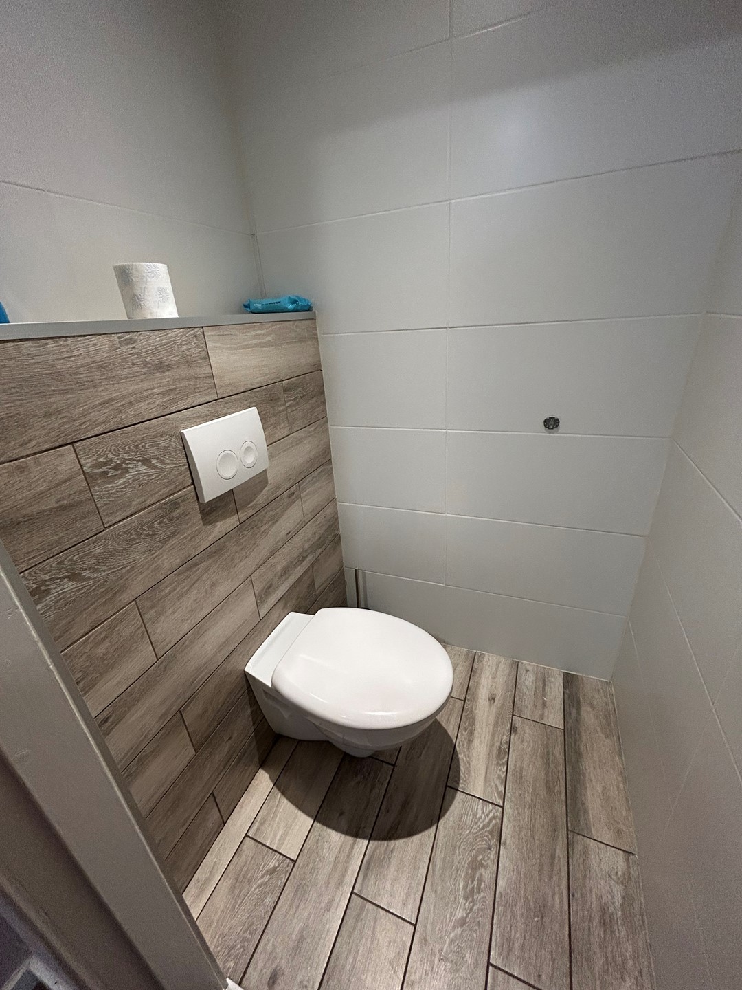 Toiletruimte 1,25 x 1,05 met laminaatvloer, inbouwspot en hangtoilet.
