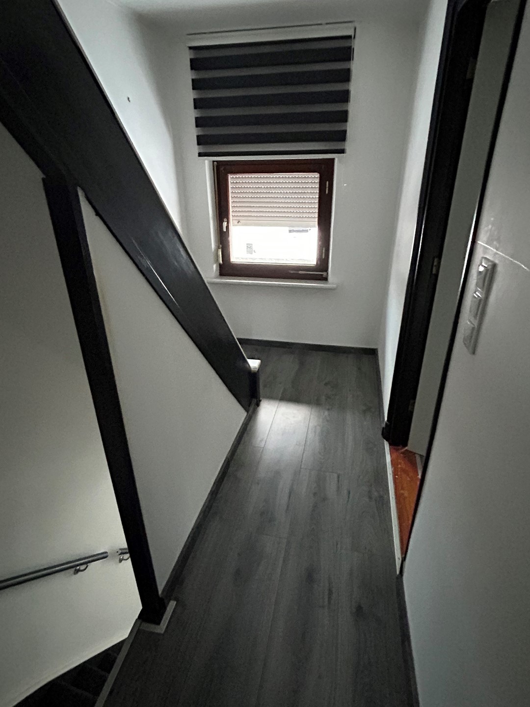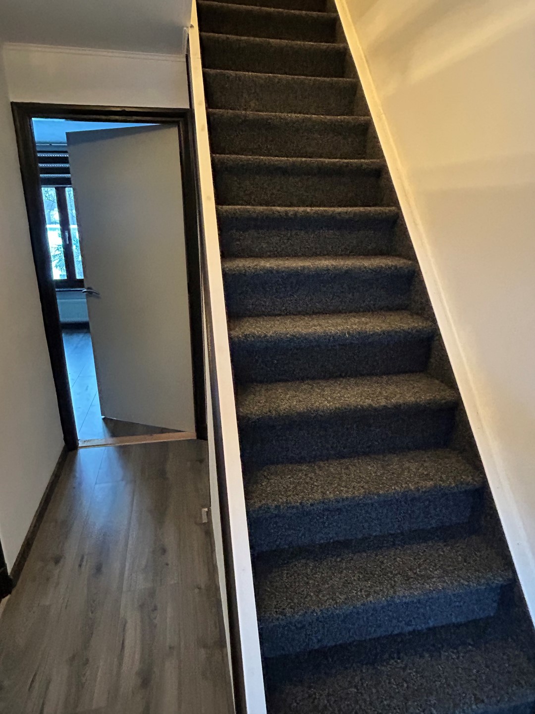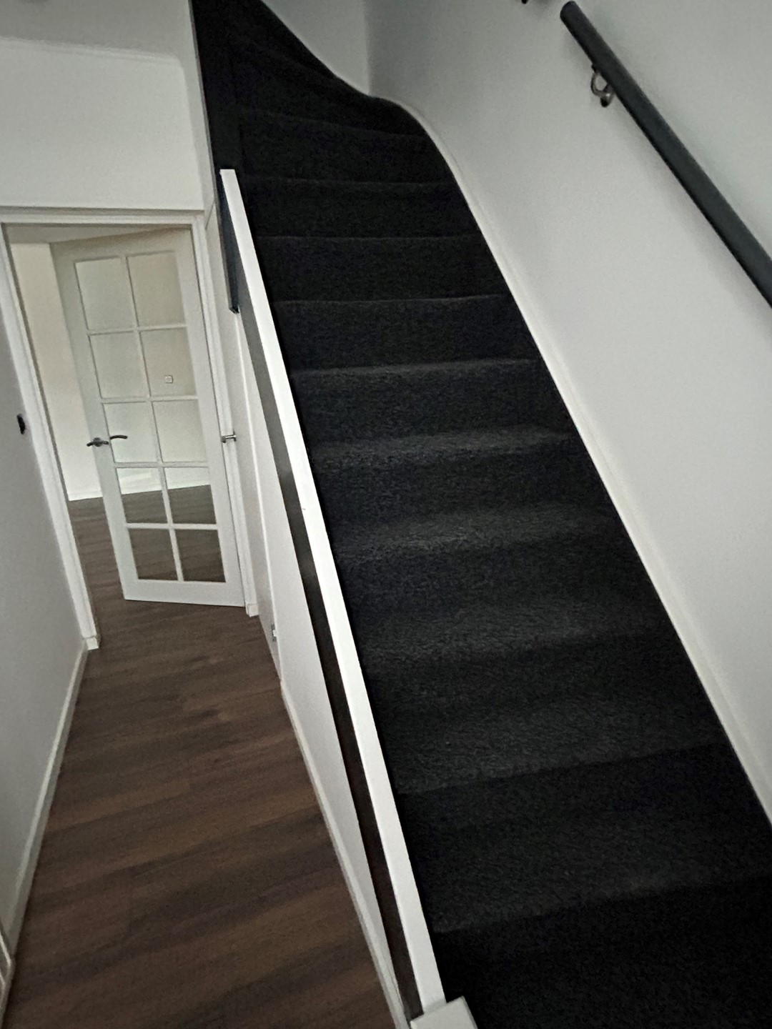 Entree/gang 3,60 x 0,90 met laminaatvloer, nieuwe meterkast met slimme meters, deur naar woonkamer en kelder en trap naar verdieping.