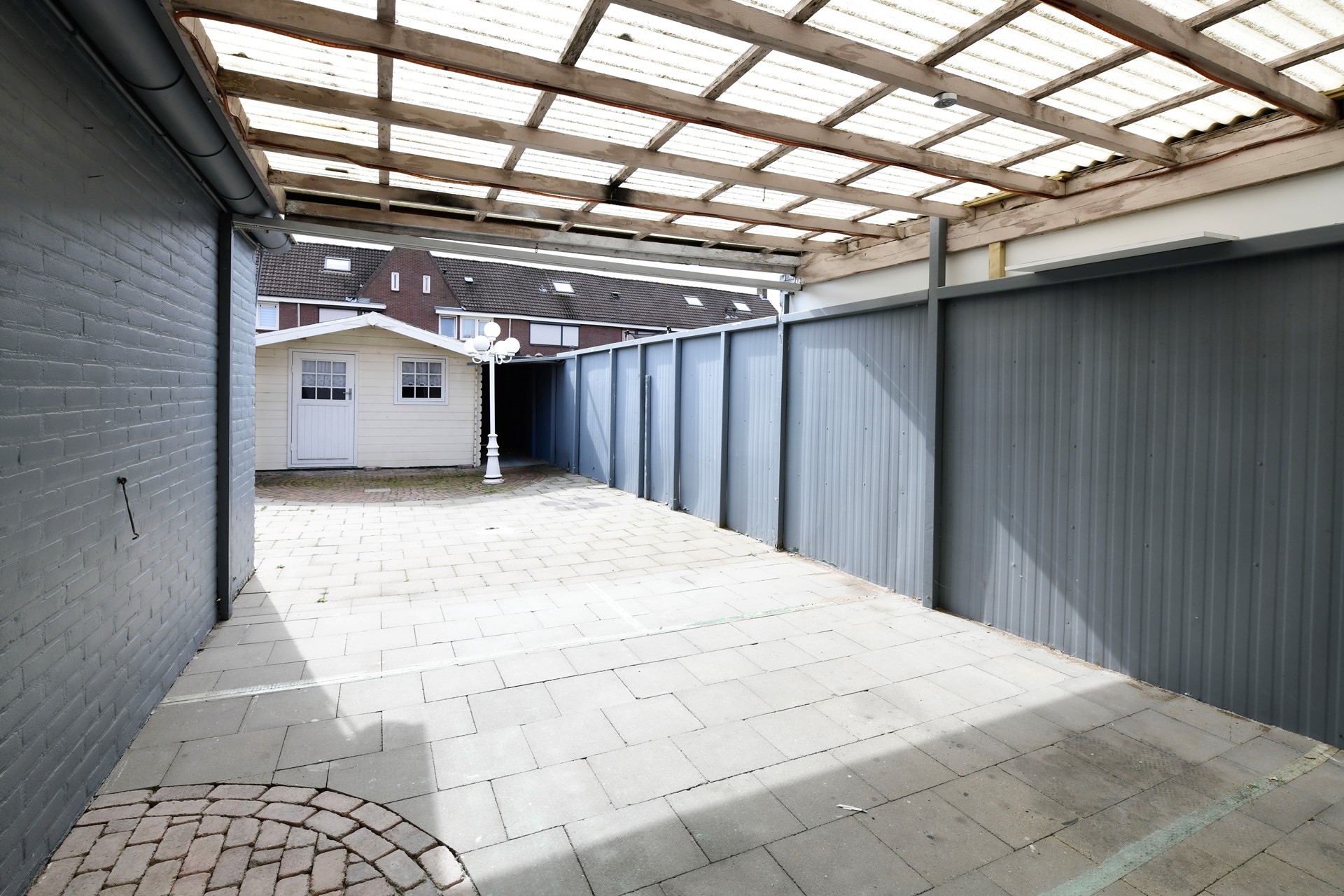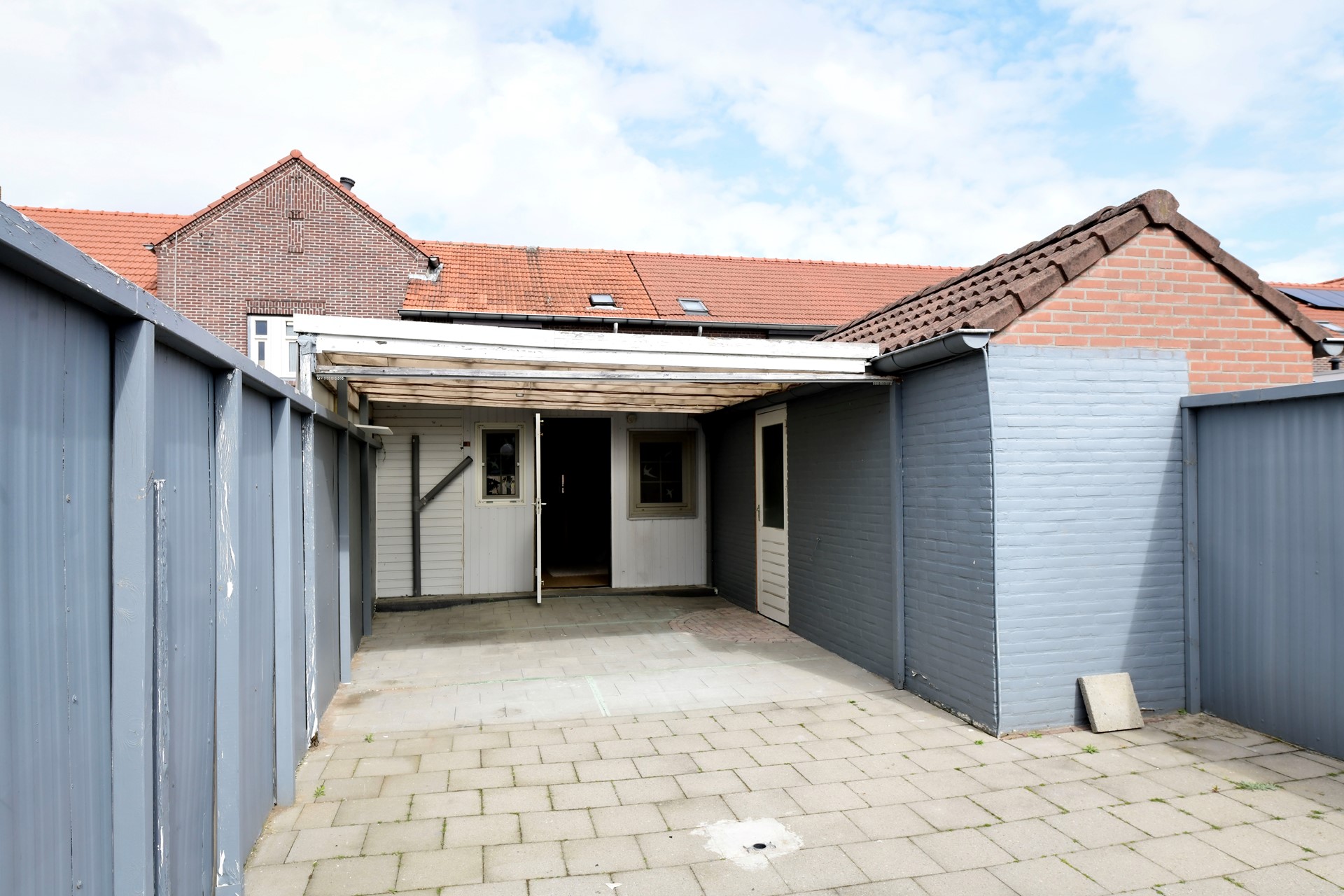 Achtertuin 12,40 x 4,90 is geheel bestraat en voorzien van stenen buitenberging 2,70 x 2,00 met elektriciteit, schutting, verlichting, overkapping 4,80 x 3,65, houten tuinhuisje 3,05 x 1,85, overdekte stalling met verlichting, en achteringang.
