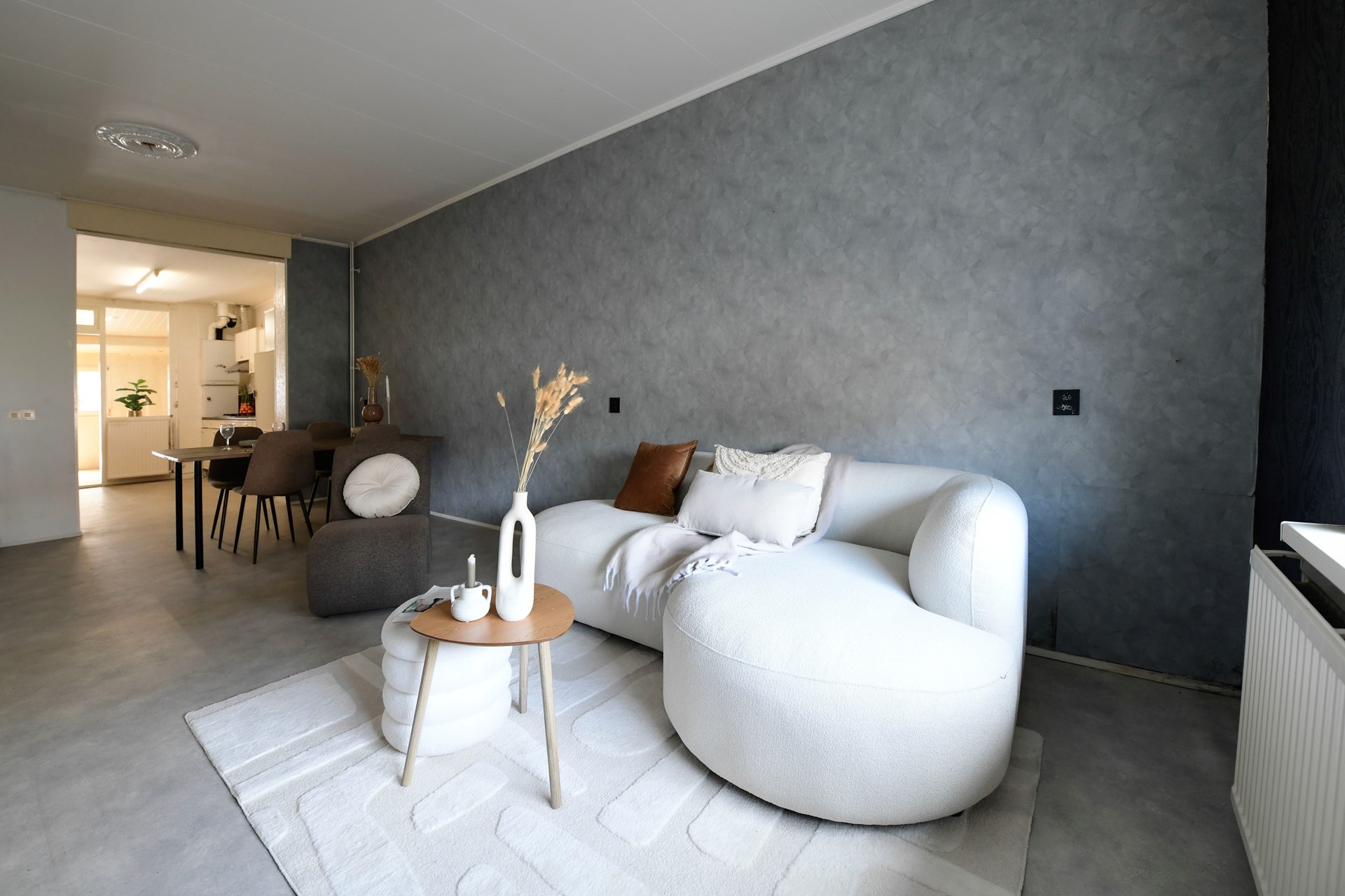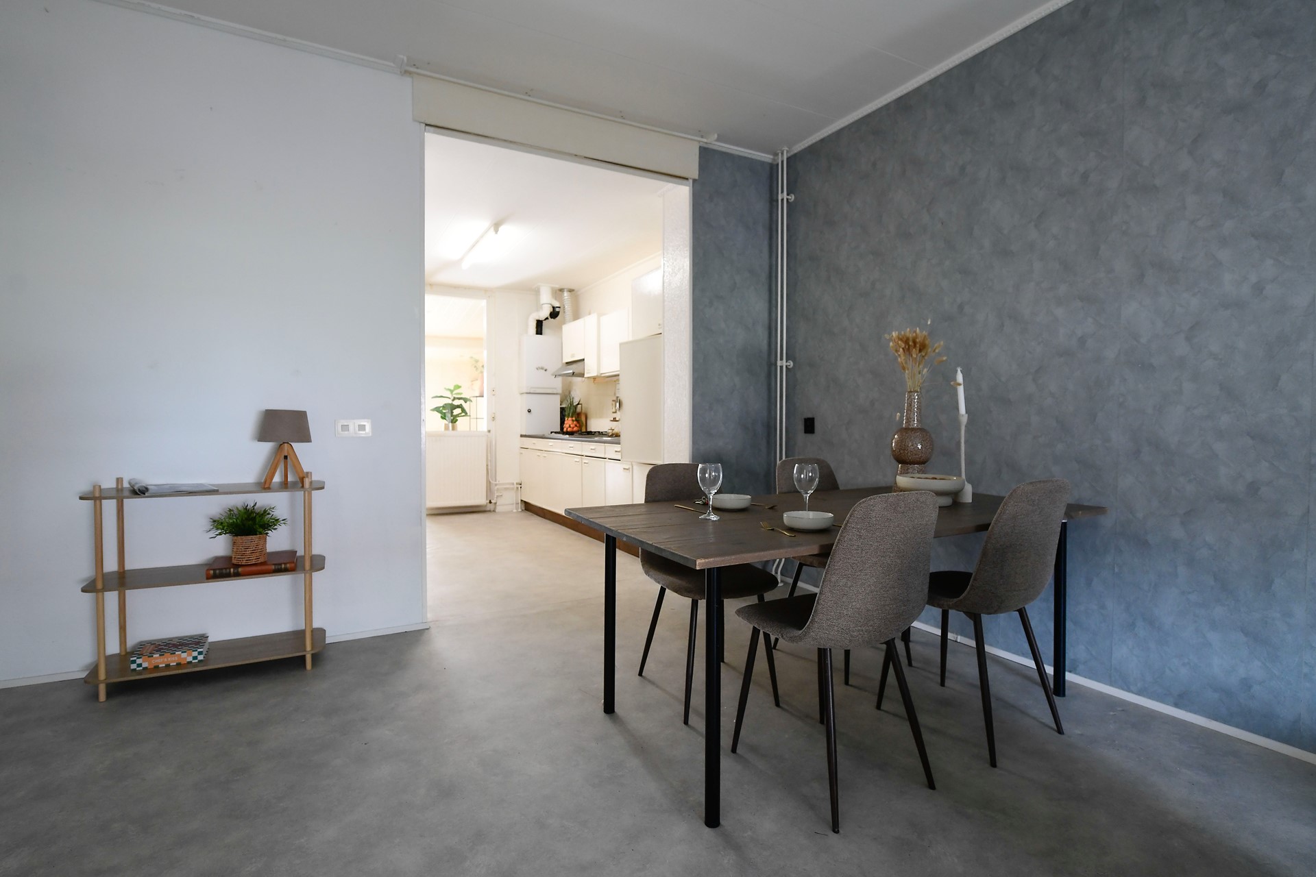 Woonkamer 6,85 x 3,60 met novilon en open keuken.