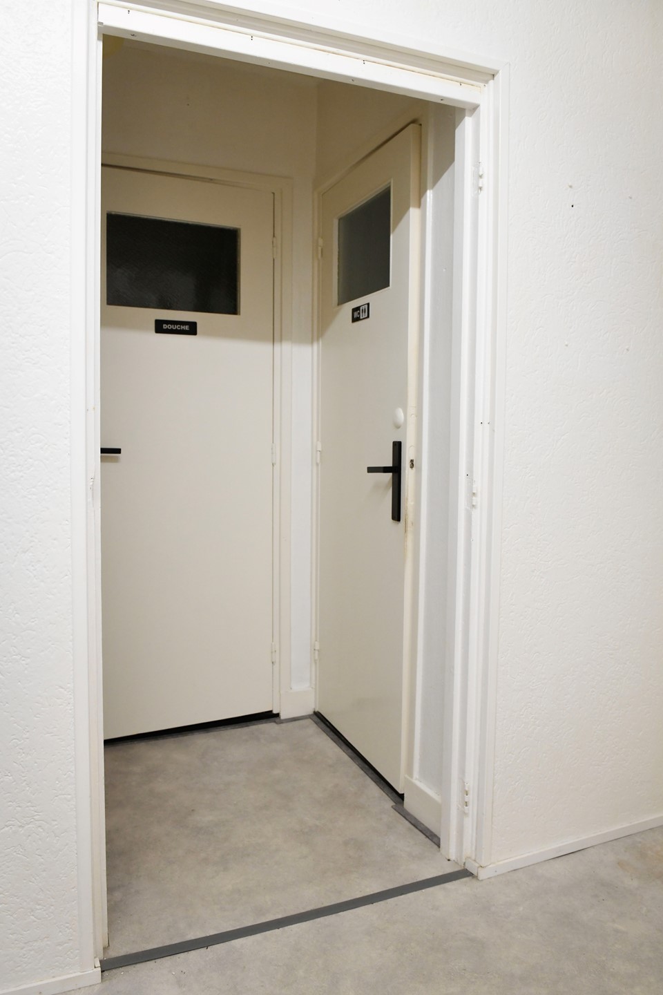 Portaal 1,05 x 0,95 met novilon, deur naar toiletruimte en badkamer en doorgang naar bijkeuken.