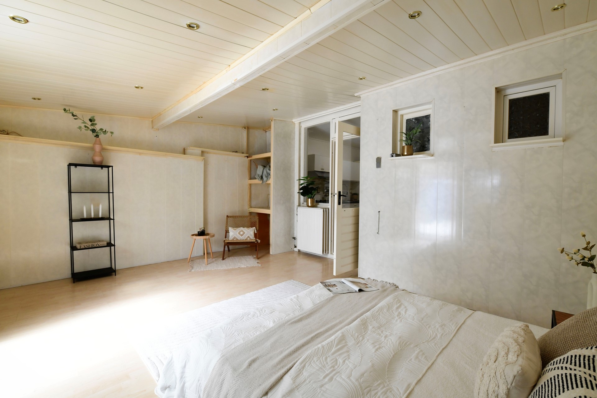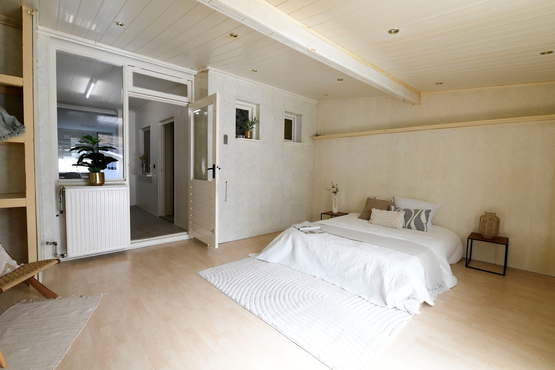 Slaapkamer 1: 5,20 x 4,20 met laminaatvloer, inbouwspots en deur naar achtertuin.