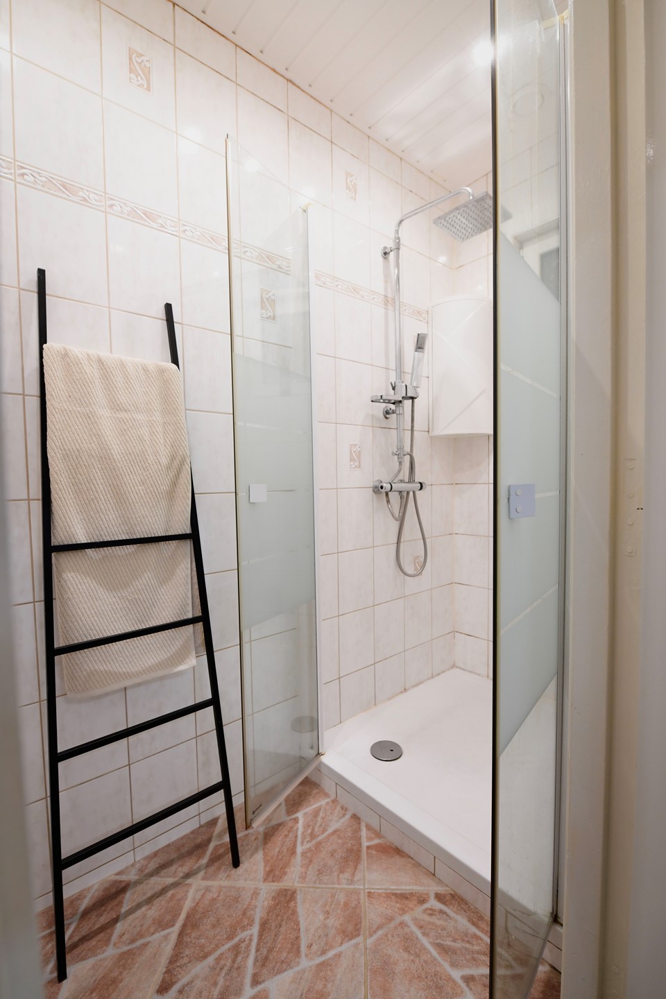 Badkamer 2,00 x 1,05 met plavuizenvloer, inbouwspots en douchecabine.