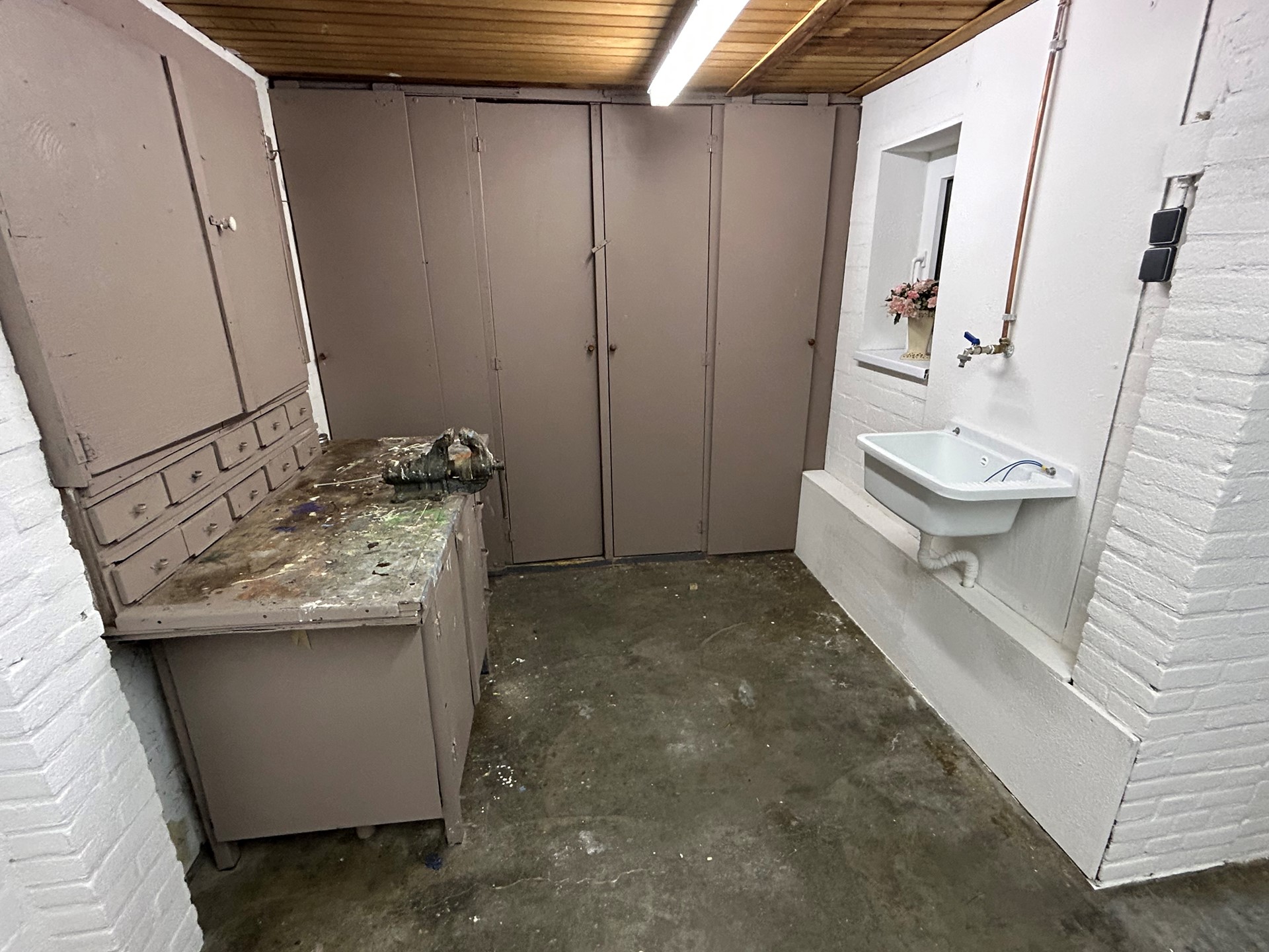 Heel nette buitenberging 3,50 x 2,45 met plavuizenvloer, aansluitingen was-apparatuur, verwarming, elektriciteit en kraan.