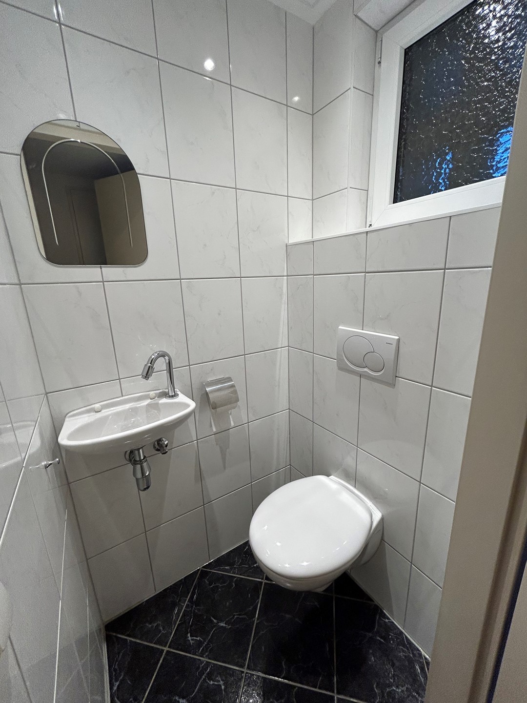 Gastentoilet 0,95 x 0,85 met plavuizenvloer, inbouwspots, hangtoilet en fonteintje.