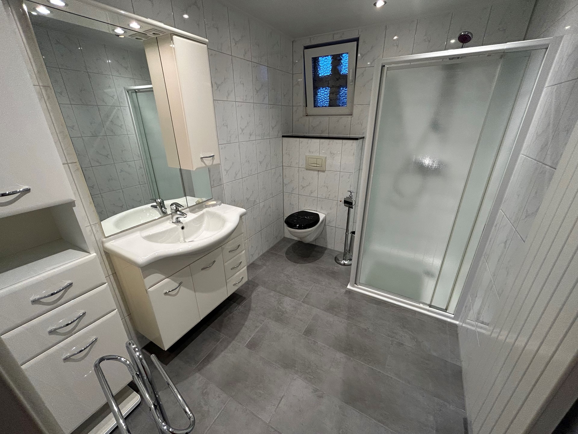 Badkamer 2,75 x 2,00 met plavuizenvloer, inbouwspots, douche met cabine, hangtoilet, badkamermeubel met wastafel en design radiator.
