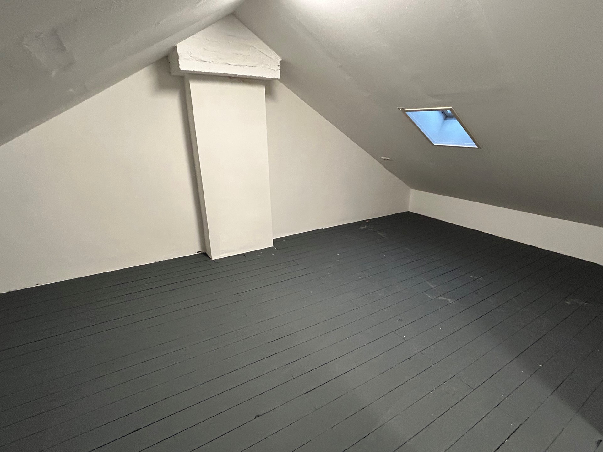 Berging/slaapkamer 3,05 x 3,95/3,25 met plankenvloer en Velux-dakraam.