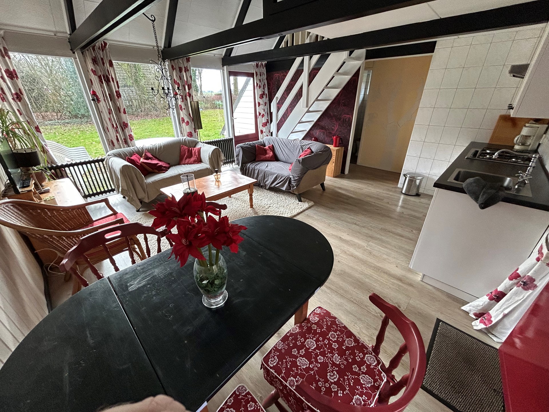 Woonkamer 4,80 x 4,70/2,35 met laminaatvloer, deur naar achtertuin en open trap naar verdieping.