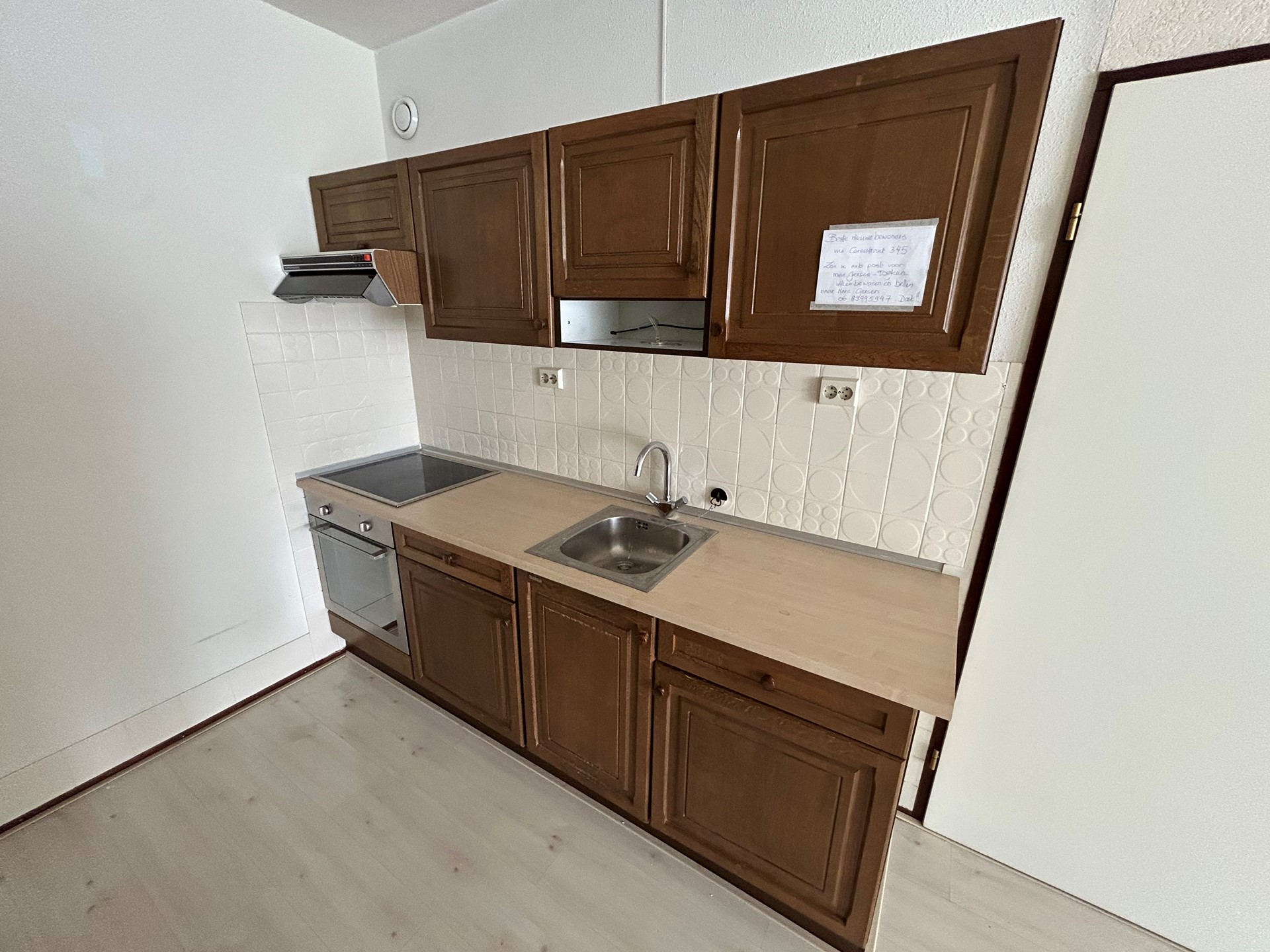 Keuken 2,55 x 2,35 met laminaatvloer en aanbouwkeuken met elektrische kookplaat met afzuigunit, bakoven, vaatwasser, koelkast en spoelbak.