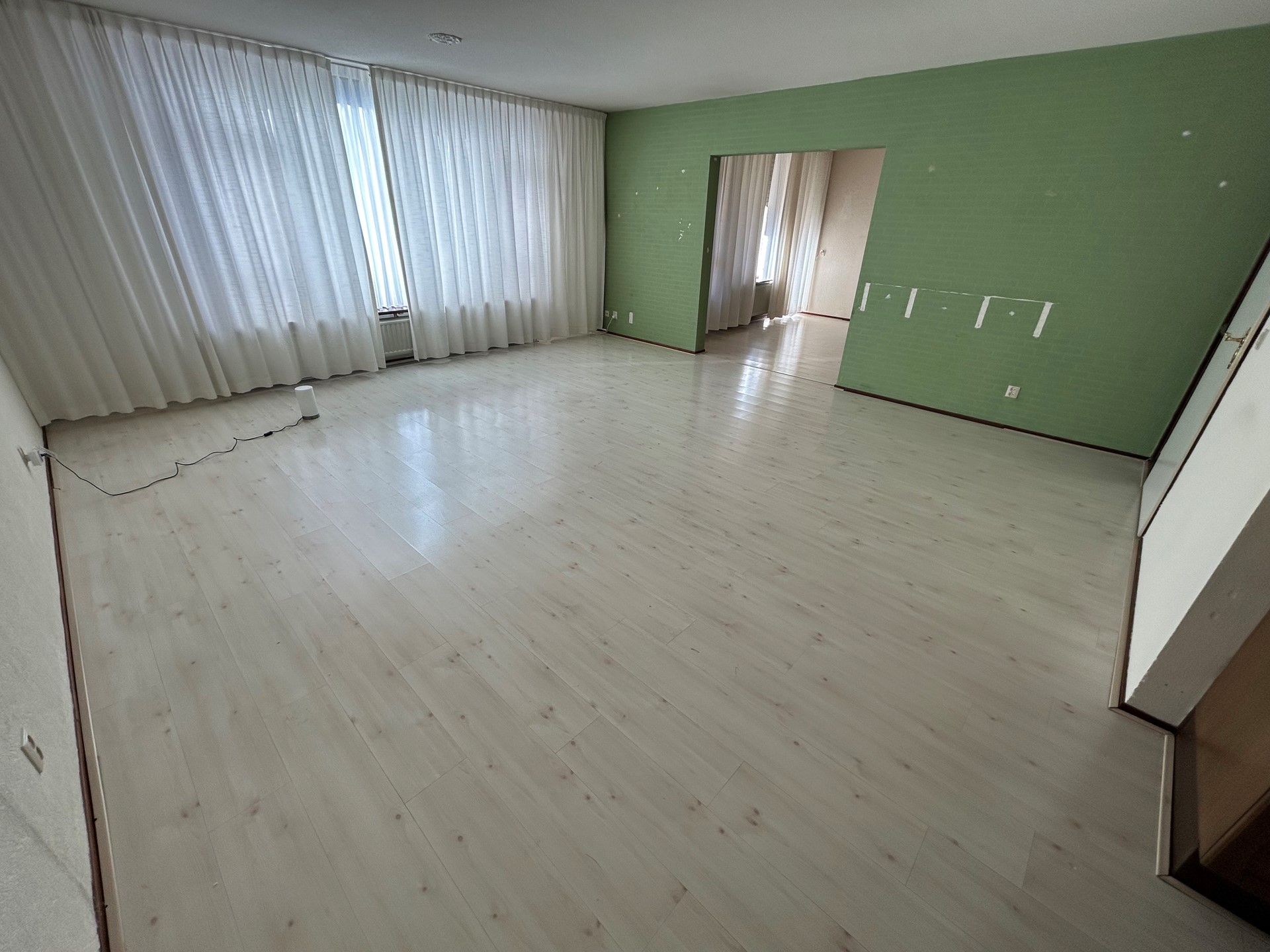 Woonkamer 6,20 x 5,50 met laminaatvloer, open keuken, doorgang naar slaapkamer en deur naar portaal.